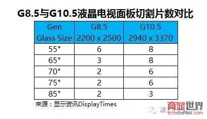10.5代线(玻璃基板大小2940mmx3370mm)相比8.5代线,切割大尺寸电视优势明显。比如,切割65英寸,8.5代线仅可切割3片,而10.5代线可切割8片,且切割效率可达95%之高。70英寸或75英寸,10.5代线都能切割到6片。