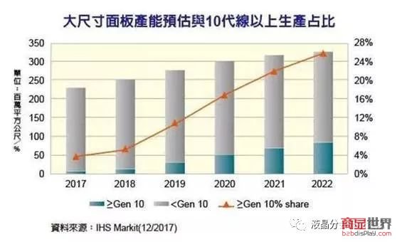京东方、华星光电与鸿海均计划在2020年前兴建数座10.5代面板产线,此外,惠科和中国电子/彩虹也在积极策划10.5代线的建设。总体来看,未来中国大陆地区10.5代线或将达7条以上。IHS Markit预估,未来10代/10.5代线将在大尺寸面板的生产中扮演更重要的角色。预计在2017~2022年间,以面积计算,10代线以上的面板产能将以59%的复合年增率(CAGR)快速成长。