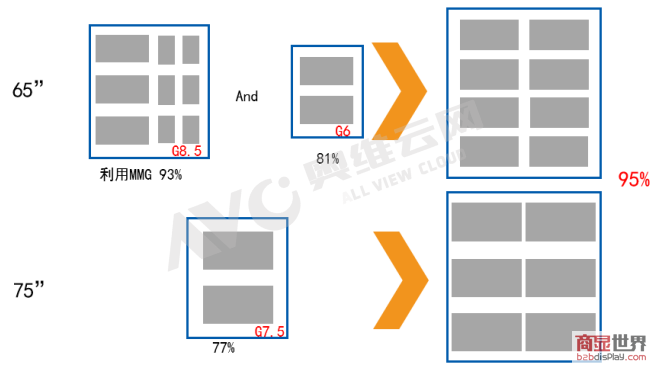 过去10年8.5代线的建设历程及55寸在终端市场获得的巨大成功让人记忆深刻,随着BOE 10.5代线逐步量产,也将意味着65”/75”时代的来临。目前65寸生产方式主要由8.5代线MMG(3片65”+6片32”),切割效率可达93%,但是由于制程需两次曝光,导致实际生产中所耗费的时间有所增加;另一种生产方式则为6代线2切,该方式虽不需要二次曝光,但是利用率却不尽人意,只能达到81%。而75寸目前生产方式则为7.5代线2切,切割效率也仅为77%。