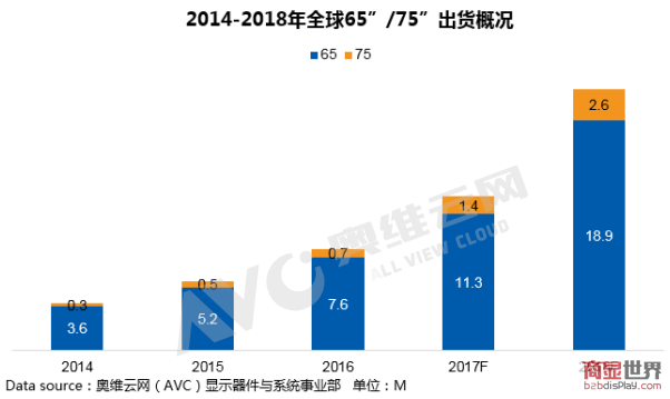 据奥维云网(AVC)显示器件与系统事业部数据显示,随着BOE10.5代线点亮,并逐步进入爬坡阶段,预计2018年65”出货量同比增长68%,75”出货量同比增长86%,可以说在10.5代线的引领下,2018年全球TV面板市场将由55寸为首的大尺寸市场逐步转向以65”/75”的超大尺寸市场。