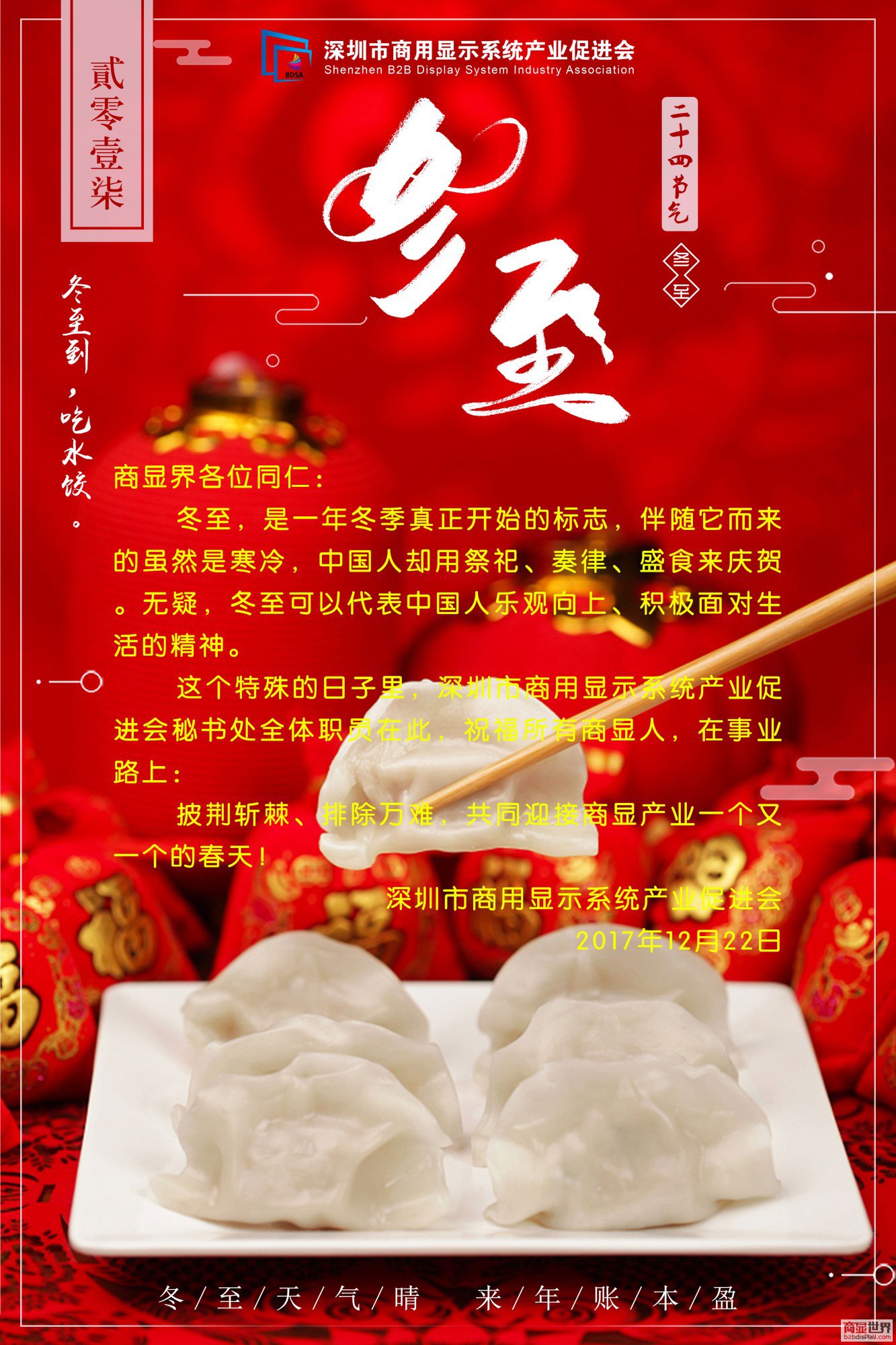 冬至,是一年冬季真正开始的标志,伴随它而来的虽然是寒冷,中国人却用祭祀、奏律、盛食来庆贺。无疑,冬至可以代表中国人乐观向上、积极面对生活的精神。 这个特殊的日子里,深圳市商用显示系统产业促进会秘书处全体职员在此,祝福所有商显人,在事业路上: 披荆斩棘、排除万难,共同迎接商显产业一个又一个的春天!