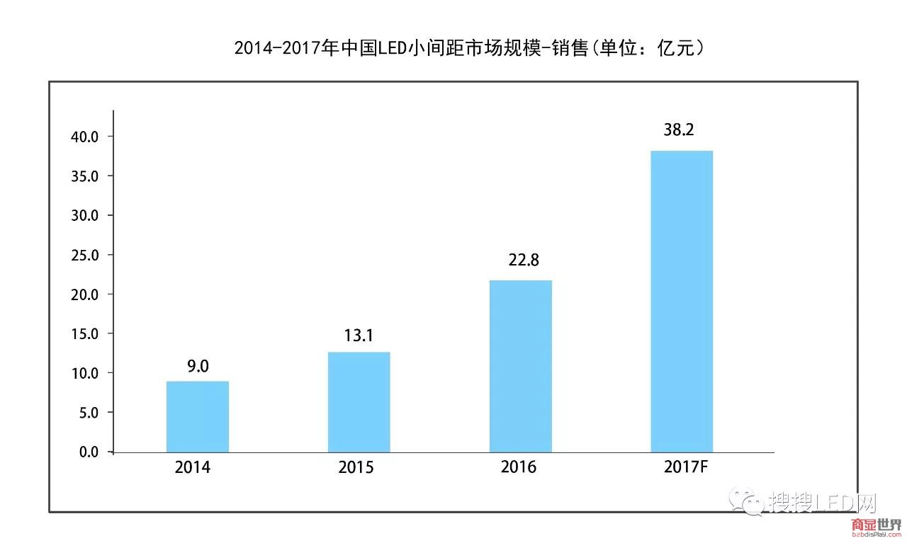 小间距LED产品应用市场率先爆发于国内市场,军事应用、安防监控、交通指挥中心、大型视频会议室等场所需求旺盛。据奥维云网(AVC)显示器件与系统大数据显示,2016年国内小间距LED显示行业销售规模达22.8亿元,同比增长74.1%,并加速向高端大屏领域渗透。预计2017年全年国内市场销售总额持续增长,有望达38.2亿元。
