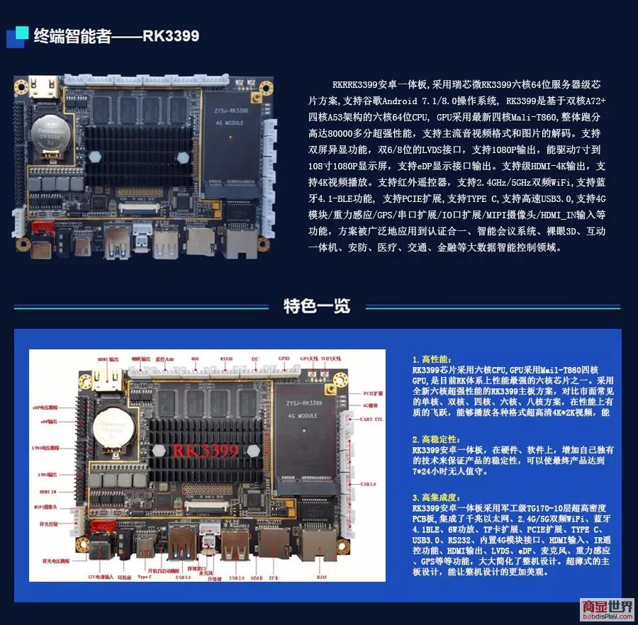 谁胜谁负?谁上谁下?或难预料。然而,以时代发展和客户体验需求带动的技术改革几乎成了多数有志企业的共识。作为在智能终端主板领域敏锐察觉市场的深圳市商用显示系统产业促进会会员单位——众云世纪,应着智慧时代的来临,也给我们带来了精品RK3399系列产品。 众云世纪RK3399行业首家批量。前置1300W,后置500W,灵活切换;LVDS+eDP双屏异显双触摸;HDMI IN画中画;USB3.0。应用行业:人脸识别、考勤系统、收银机、售货机等高端人工智能或新型零售行业。