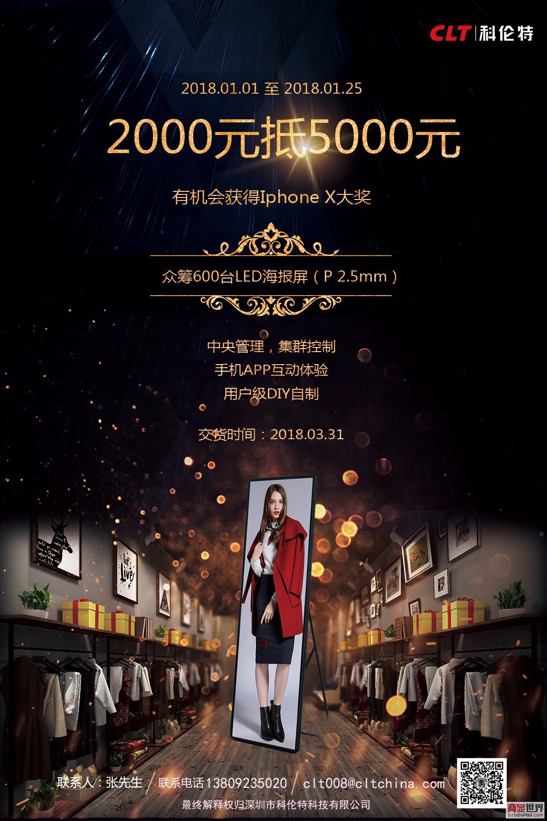 聚焦LED商显,深圳市商用显示系统产业促进会副会长单位——CLT科伦特行业首创众筹模式向中国业务区市场海量推广LED海报屏,抢占市场先机,形成有规模化竞争力的行业效应。海筹计划,CLT科伦特打响2018新年LED商显第一枪!