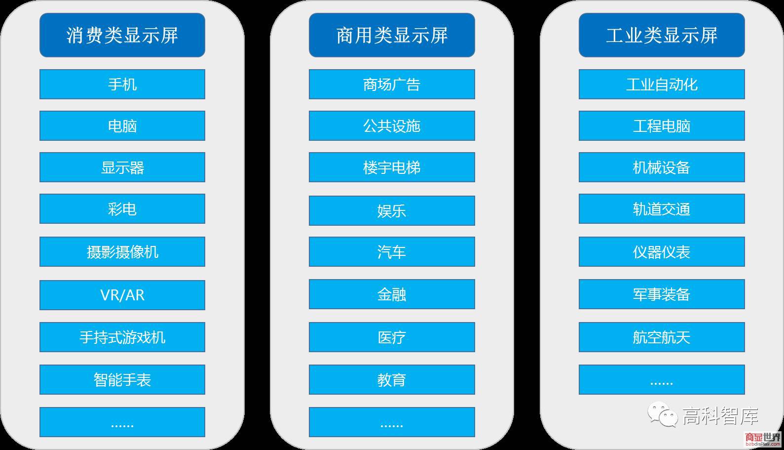 显示应用分类 根据应用领域的不同,液晶显示屏可以分为三大类:消费类显示屏、商业类显示屏和工业类显示屏。 消费类显示屏包括:手机、电脑、显示器、彩电、智能手表、VR&AR、可穿戴设备、摄影师相机、手持游戏机、家用电器等面向个人和家庭的应用领域。 商业类显示屏包括:商场广告、公共设施、楼宇电梯、办公设备、汽车、金融、医疗、教育、娱乐等商业应用领域。 工业显示屏包括:工业自动化、工程电脑、机械设备、仪器仪表、轨道交通、航空航天、军事装备等工业应用领域。