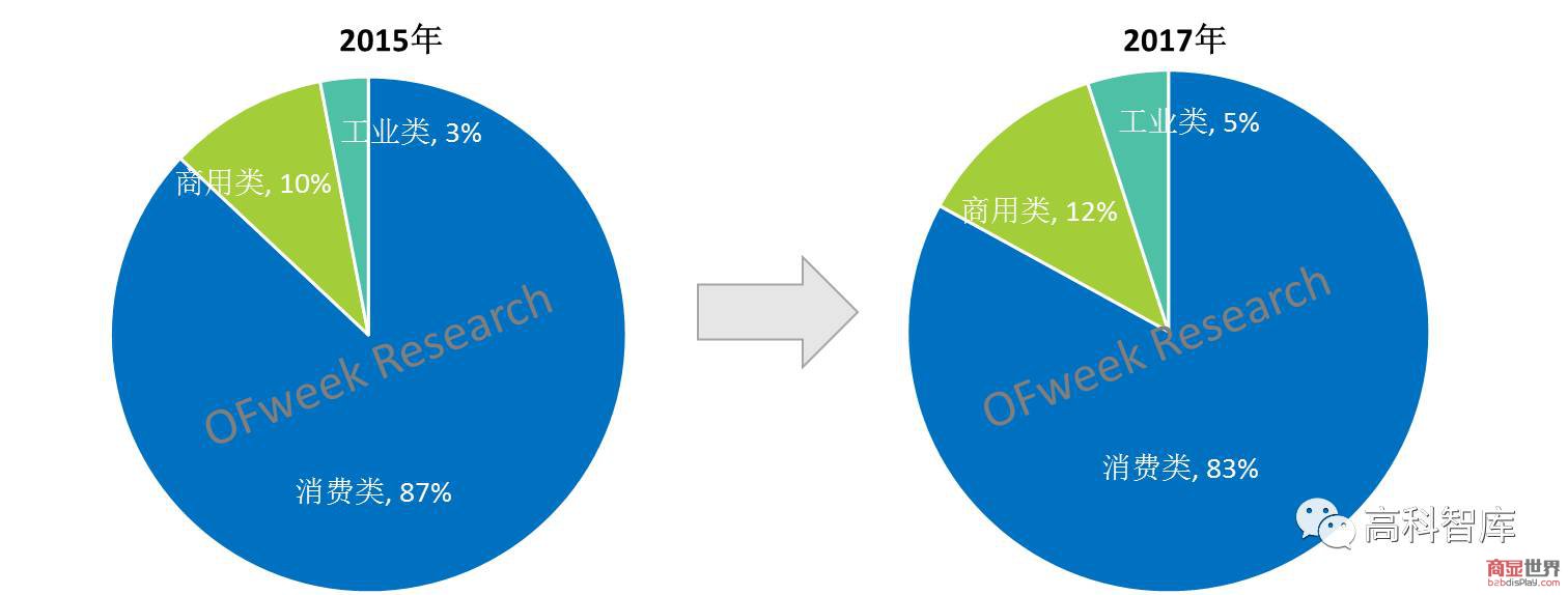 2015 vs 2017全球液晶显示屏分类应用出货占比;资料来源:高科智库,OFweek行业研究中心