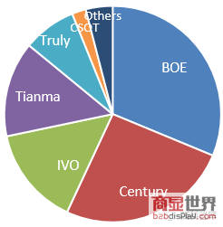 中国液晶显示屏厂商消费类应用出货份额;资料来源:高科智库,OFweek行业研究中心 国内商用类液晶显示屏的主要生产厂商有天马、京东方、龙腾光电、深超光电、信利等。 天马在商业类领域主要应用于医疗(通过收购的日本NLT子公司)、车载等领域。京东方则主要应用于车载、广告、医疗、电子价签、艺术画屏等领域,后续随着京东方与阿里巴巴在智慧零售领域的合作不断深化和推进,看好其在电子价签和艺术画屏等领域的创新应用。龙腾光电和深超光电在商业类领域主要应用于车载;信利则在车载显示、家用电器和办公室设备等领域有较多的应用。 国内工业类液晶显示屏的主要生产厂商有信利、京东方、深超光电、天马等。信利工业类显示屏主要应用于工业电脑、工业自动化、仪器仪表等领域;深超光电则以6-14寸的中小尺寸工控应用居多;天马主要应用在中小尺寸工业显示屏领域。