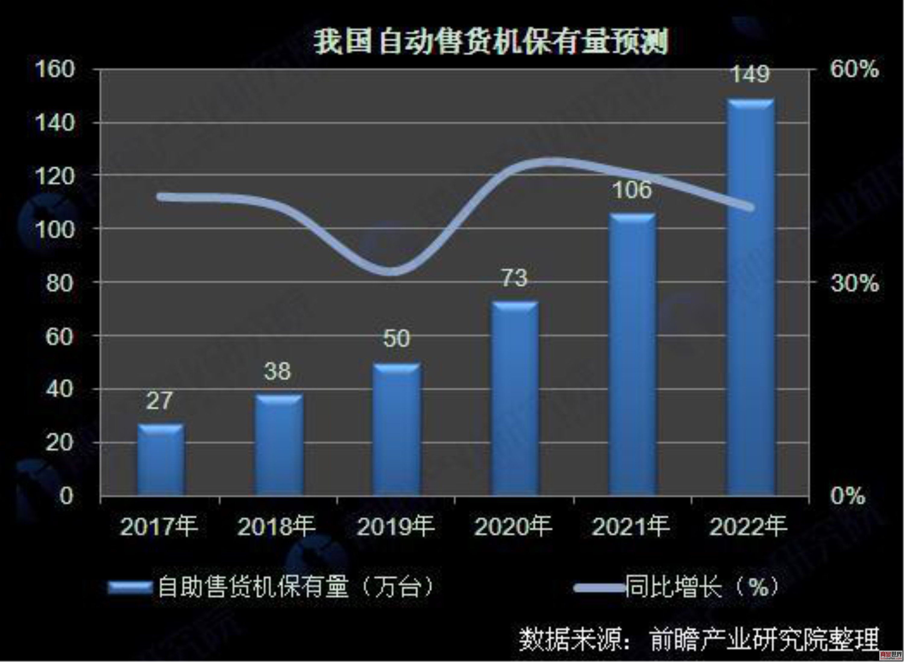 根据前瞻产业研究院发布的《2018-2023年中国自助售货机行业市场前景预测与投资战略规划分析报告》数据显示,截至2016年底我国自助售货机的存量在19万台左右,据预测到2022年我国的自动售货机保有量或将达到149万台!