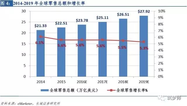 全球零售市场增速将放缓。全球零售总额在2015年达到22.5万亿美元,比2014年增长5.6%。据eMarketer预测,到2019年,全球零售总额将达到28万亿美元,但在接下来的几年中,每年的增长速度回放缓,平均增长率为5.6%。