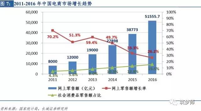 从占比来看,全国网上零售占比逐年增加,但网上零售的增长速度大大减慢。 2016年全国网上零售总额51,555.7亿元,比上年增长26.2%,增速下降7.1个百分点。