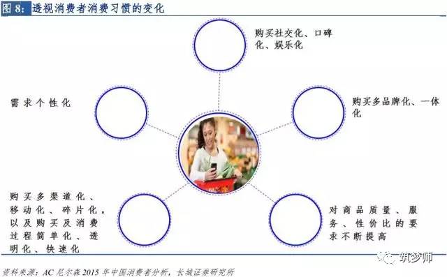 据AC尼尔森2015年中国消费者分析的结果,我国消费者行为特征已转变为:需求个性化,购买社交化、口碑化、娱乐化,购买多品牌化、一体化,对商品质量、服务、性价比的要求不断提高,购买多渠道化、移动化、碎片化,以及购买及消费过程简单化、透明化、快速化。