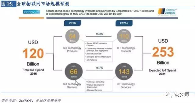市场规模方面,据ZINNOV数据,2016年全球企业在物联网技术的产品和服务上的支出预计将达1200亿美元,2021年这个数字将增长到2530亿美元,达到16%的年复合增长率。