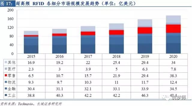 各细分应用市场而言,服装零售业使用的UHF RFID标签约占市场的8成,据IDTechEx数据,2015年销售的47.05亿个超高频RFID标签中,约37.5亿个用于服装行业。