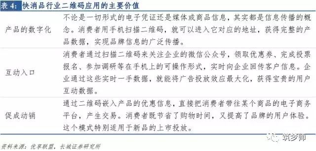 快消品行业是较早使用二维码强化O2O营销的行业,2014年恒大冰泉与A股上市公司天源迪科在二维码商业模式上的合作,掀起了快消品行业二维码应用浪潮,五粮液、茅台、古井贡、王老吉等厂商纷纷也采用二维码商业模式。