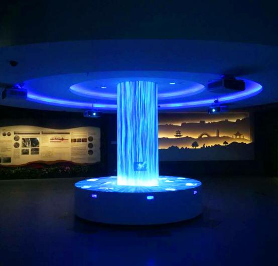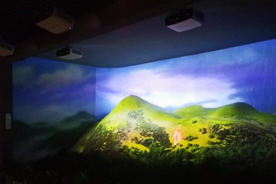 在这里,光影技术再次大显身手:立体曲面融合显示将武功山的前世今生,距今8~5.7亿年的历史,浓缩在一段光影之中——从大洋深海,到板块的碰撞,再到喜马拉雅运动,逐步形成的武功山变质核杂岩构造景观几乎触手可及。视美乐8台SML—PU550投影系统,构成3×7米的沙盘模型,利用光影和声效向人们述说着武功山沧桑而又独特的历史与地质构成。
