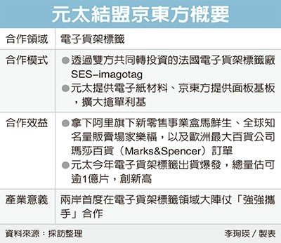 全球电子纸龙头元太结盟大陆面板一哥京东方,携手跨足当红的电子货架标签领域,打入阿里巴巴旗下新零售事业,以及家乐福、玛莎百货(Marks & Spencer)等全球知名量贩、百货业者供应链。