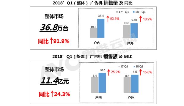 借助新媒体等行业的迅猛发展,2018年一季度广告机市场整体销量再创新高。根据深圳商显产促会副会长单位奥维云网(AVC)《中国大陆广告机市场季度研究报告》显示,一季度中国大陆户内广告机市场销量为36.8万台,同比增长93.5%;户外广告机市场销量为0.4万台,同比增长10.9%。