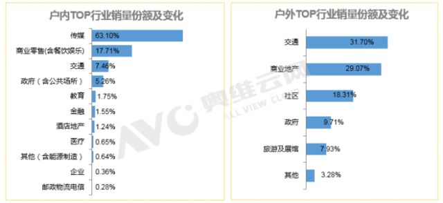2018年一季度,因传媒行业对广告机的需求急剧上升,户内广告机销量激增,预计全年传媒行业的广告机需求数量将突破200万台大关。与传统媒体比较,户外广告机因款式及播映方式多元化,有更高的投入产出比,成为了近年来起步晚发展快的宣传媒介,一季度在交通及商业地产行业的占比也有小幅度提升。