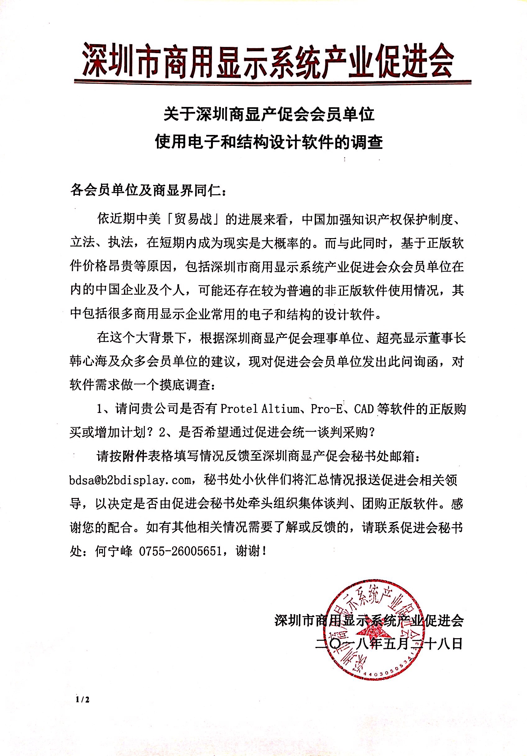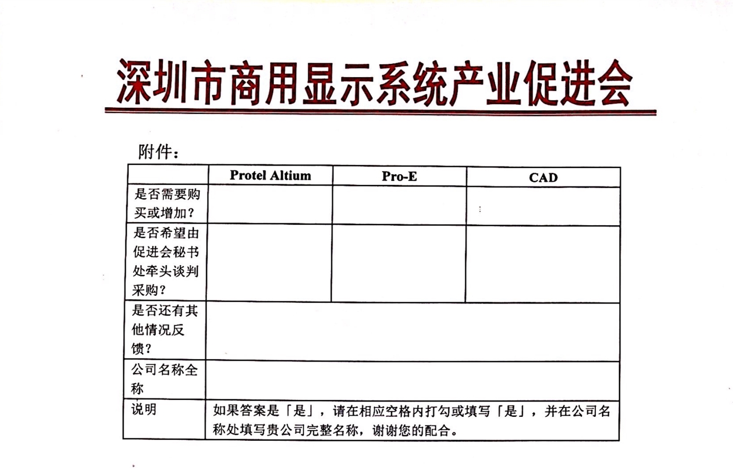 请按下列表格填写情况反馈至深圳商显产促会秘书处邮箱:bdsa@b2bdisplay.com,秘书处小伙伴们将汇总情况报送促进会相关领导,以决定是否由促进会秘书处牵头组织集体谈判、团购正版软件。感谢您的配合。