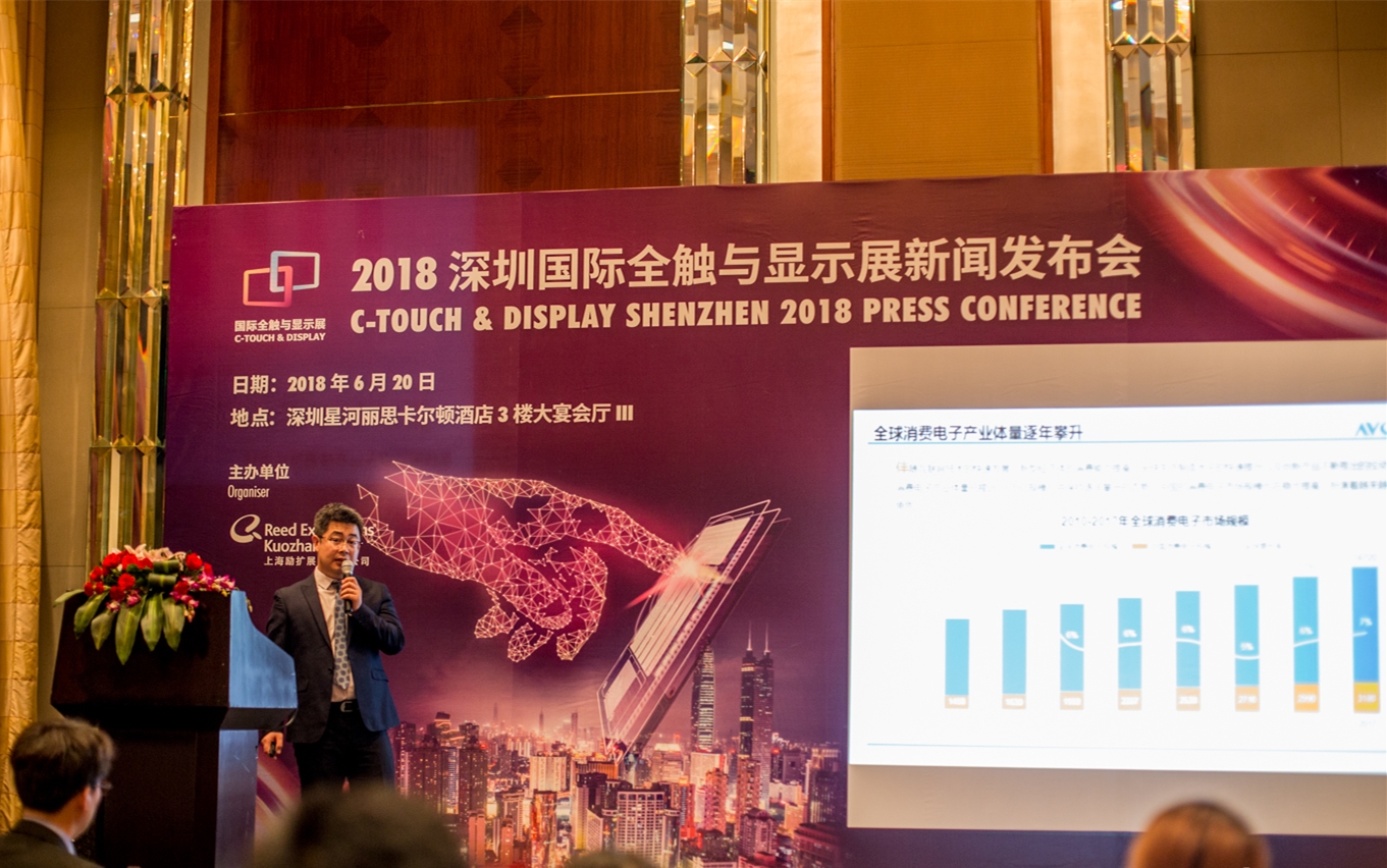2018年6月20日下午,由上海励扩展览有限公司主办的「2018深圳国际全触与显示展新闻发布会」在深圳星河丽思卡尔酒店顿隆重召开。励展博览集团大中华区副总裁冯永光、深圳商显产促会副会长单位北京奥维云网大数据科技股份有限公司研究副总监李洪亮、IHS Markit资深分析师林麟、宸鸿科技研发处长纪贺勋、中国柔性显示技术(材料)国际论坛组委会秘书长徐世颖以及众多行业媒体参与了这次新闻发布会。