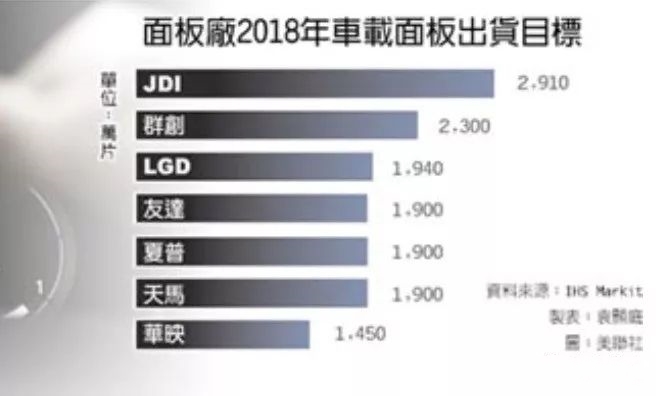 IHS Markit表示,仪表板面板因质量、信赖性要求高,目前日本还是主要供货商,JDI很大比重是供应3.5吋、4.2吋仪表板面板,尤其愈来愈多高级车种导入全数字仪表板,因此10吋、12.3吋仪表板出货快速成长。 日本和台湾面板厂2017年关注焦点转往仪表板面板,JDI出货成长14%,友达出货更是倍增,群创出货成长了32%。 韩国、大陆面板厂也有很大的成长,LGD出货年增17%,天马则成长了35%。