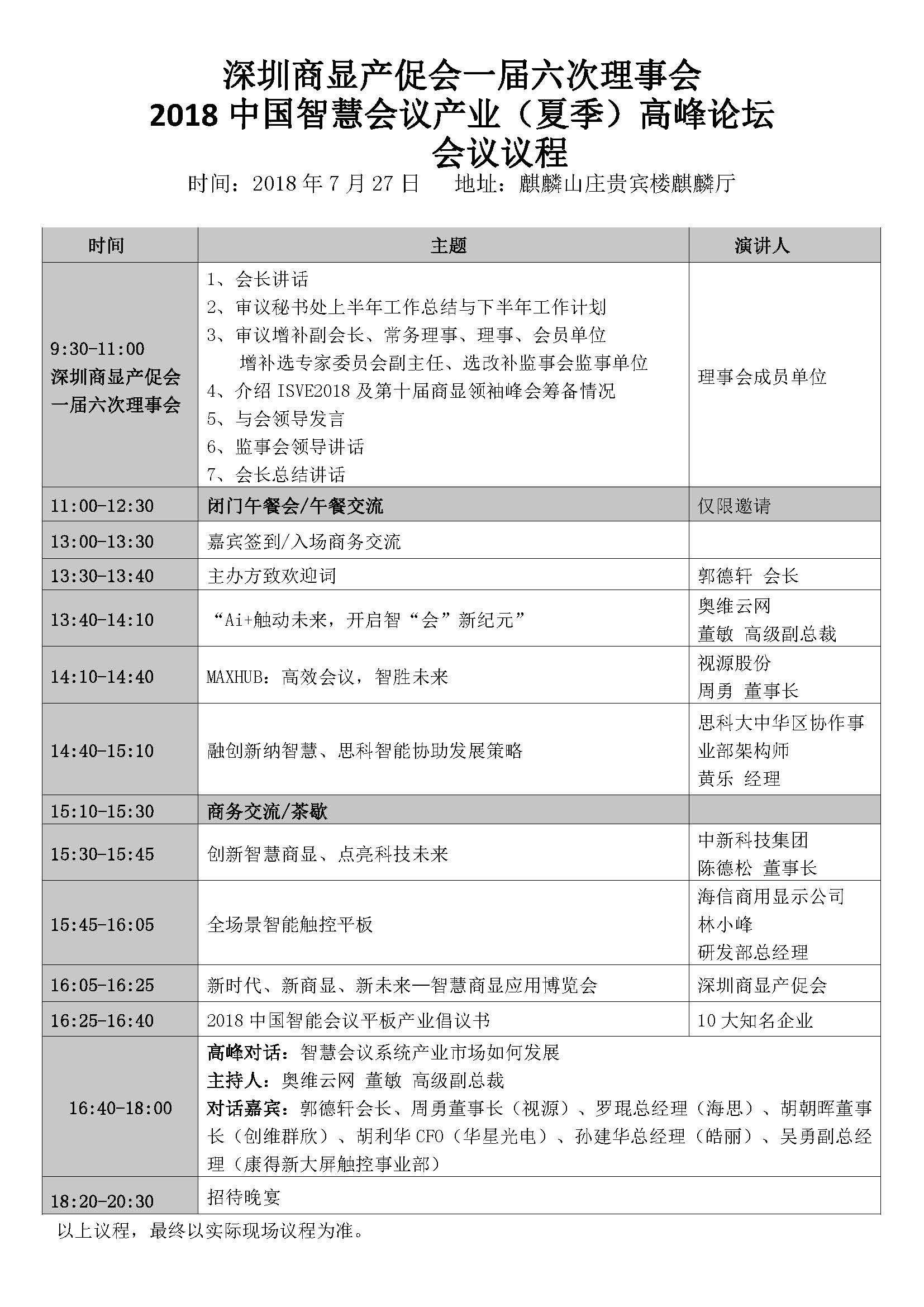 为了契合与会嘉宾的行程需求,再特此献上本届论坛攻略,尽快收藏! 2018中国智慧会议产业(夏季)高峰论坛 △中国·深圳·麒麟山庄 2018年7月27日下午 1:00-6:00 峰会 6:20-8:30 晚宴 1 会议议程