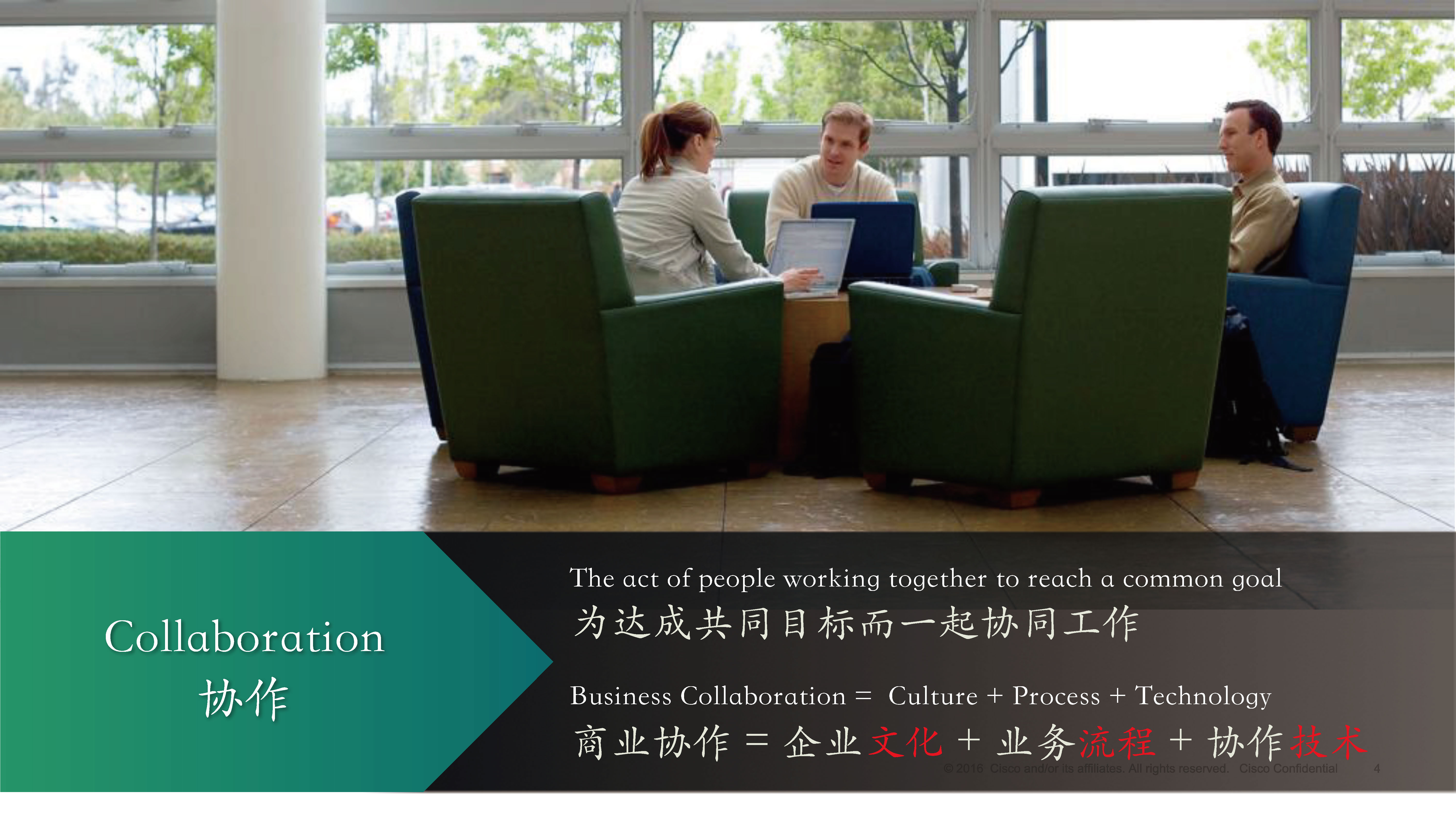 商业级的协作,有几个主要元素,最基础的是技术,没有技术很多事情就没有办法完成,所以必须有技术积累。真正的协作是基于人、基于公司,人与人之间有差异,公司与公司之间也会有差异。真正商业级协作,必须要融入到企业的流程和文化中,这才是一个真正的商业级协作。基于这样的理念,思科做了一些规划。