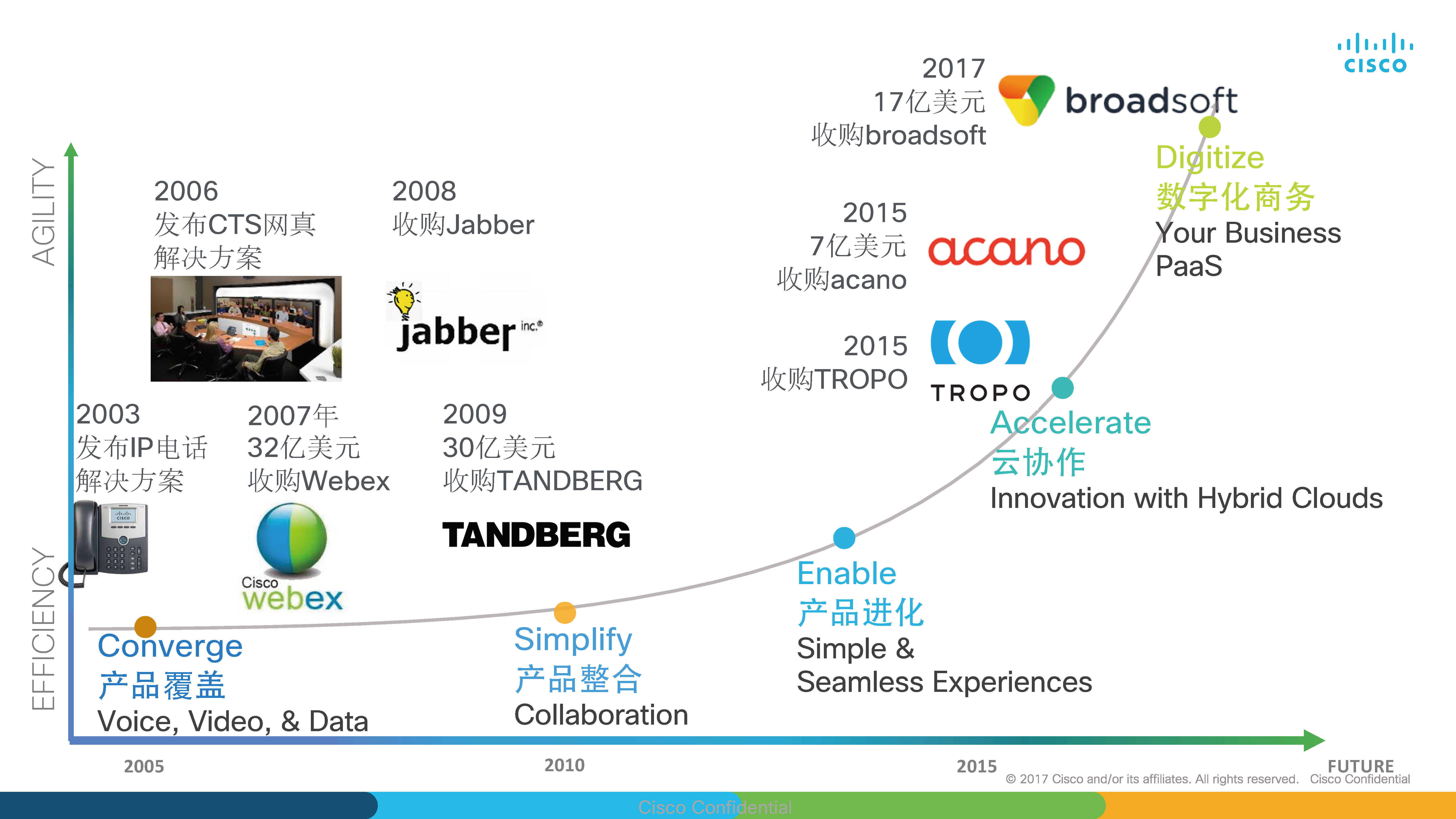 第一阶段,先做产品覆盖,也就是技术积累。因为通讯在协作里是讲人与人的沟通,通讯手段需要非常丰富,不会只有一个,有视频的、语音的、文字的、内容的,这些都需要不同的技术手段去积累才能达到,因为人与人的沟通应该是多种方式的。所以2005年时,思科就开始做产品覆盖。