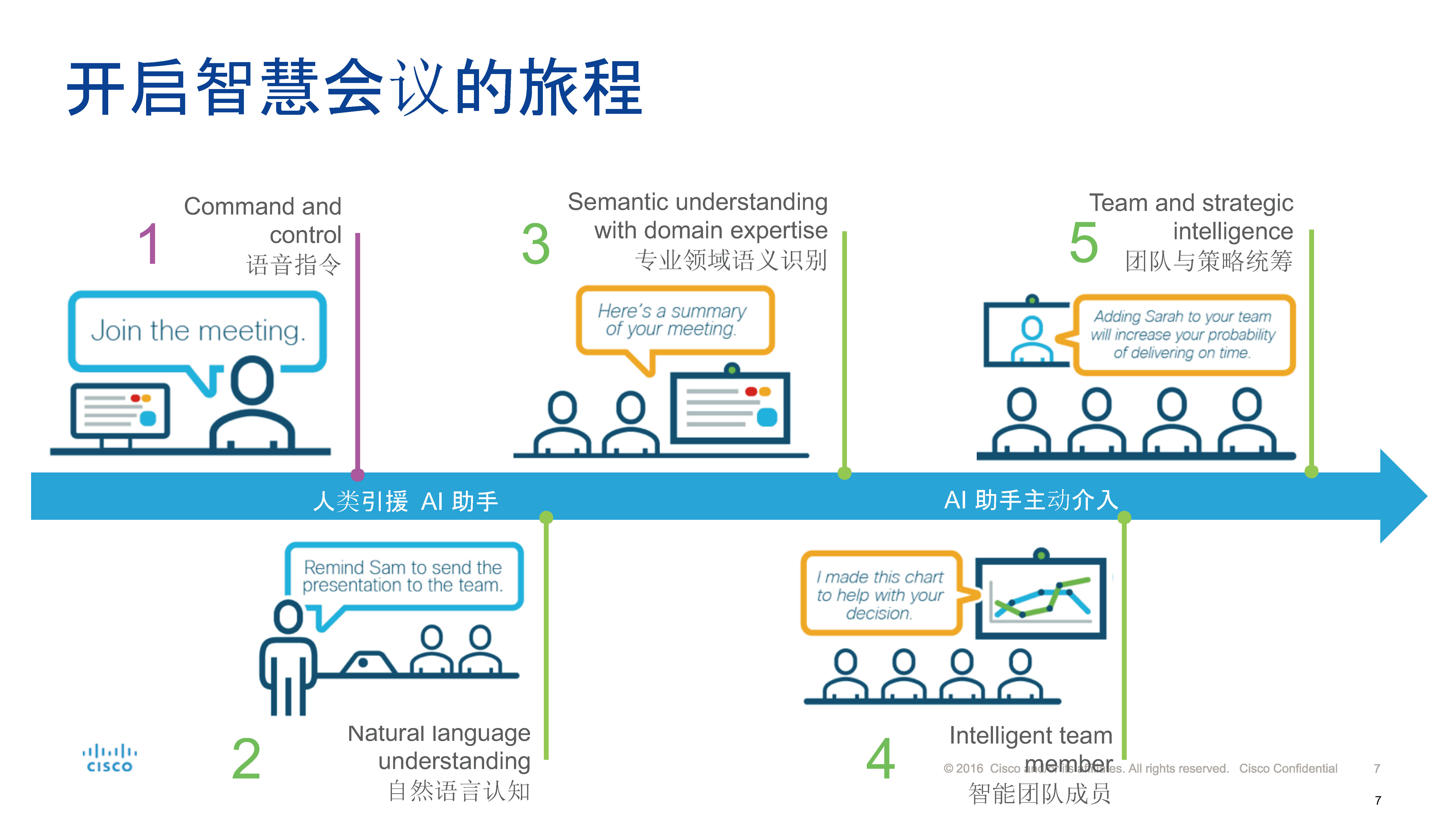 思科认为,智慧、AI跟会议之间会经历这五个阶段。