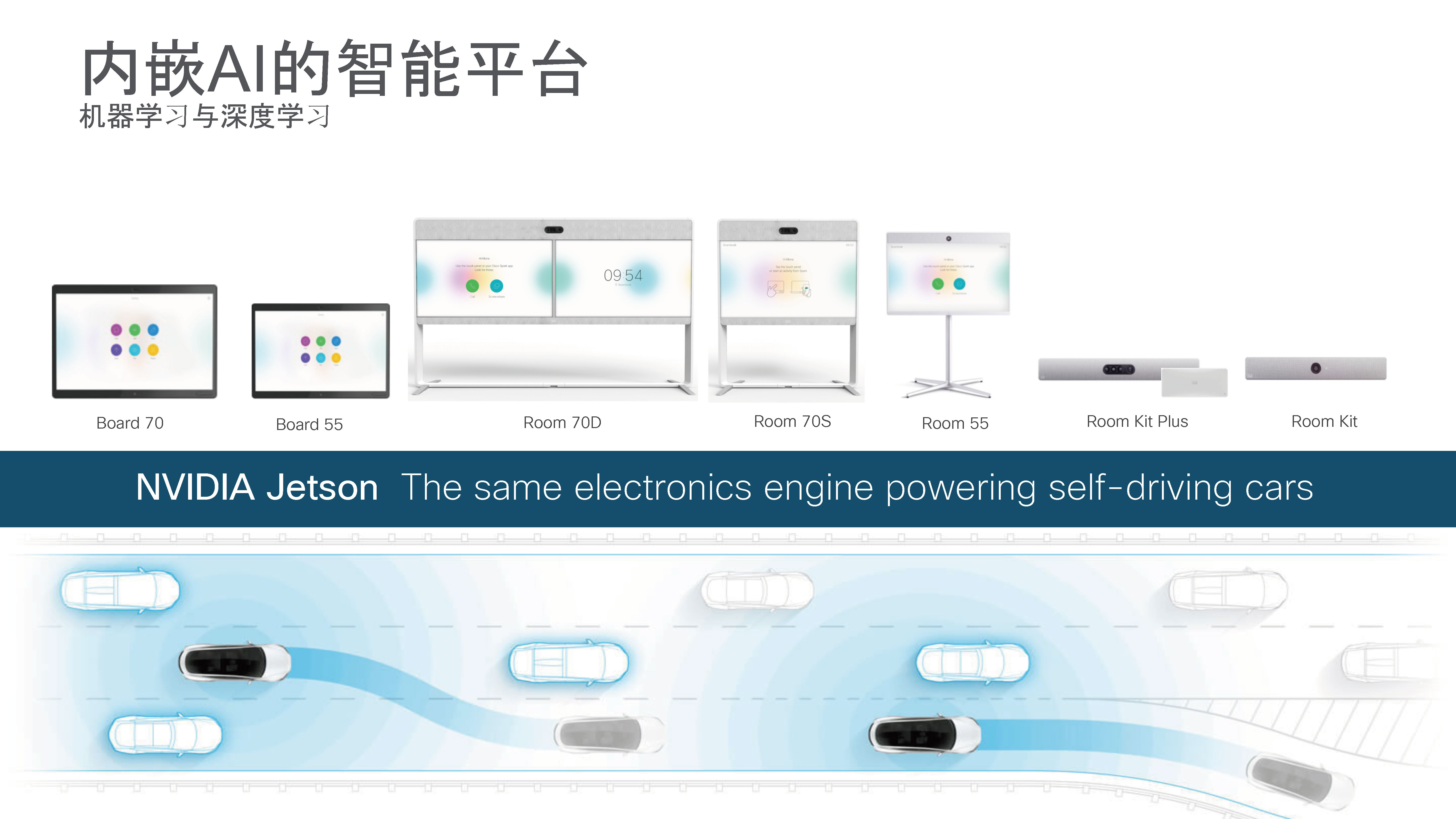 但它最关键、最厉害的一点在哪里?是它内嵌了AI芯片。Room系列的产品线,都嵌入了NVIDIA Jetson芯片。自动驾驶、智能汽车是如今非常火的议题,在谷歌的自动驾驶中用的芯片就是NVIDIA Jetson,它是一个为AI做准备的芯片。而我们整个Room系列的产品、前端都嵌入了这样一个AI芯片。为何要这样?因为我们要把「智能」放到每一个前端设备、每一個人机交互界面上。
