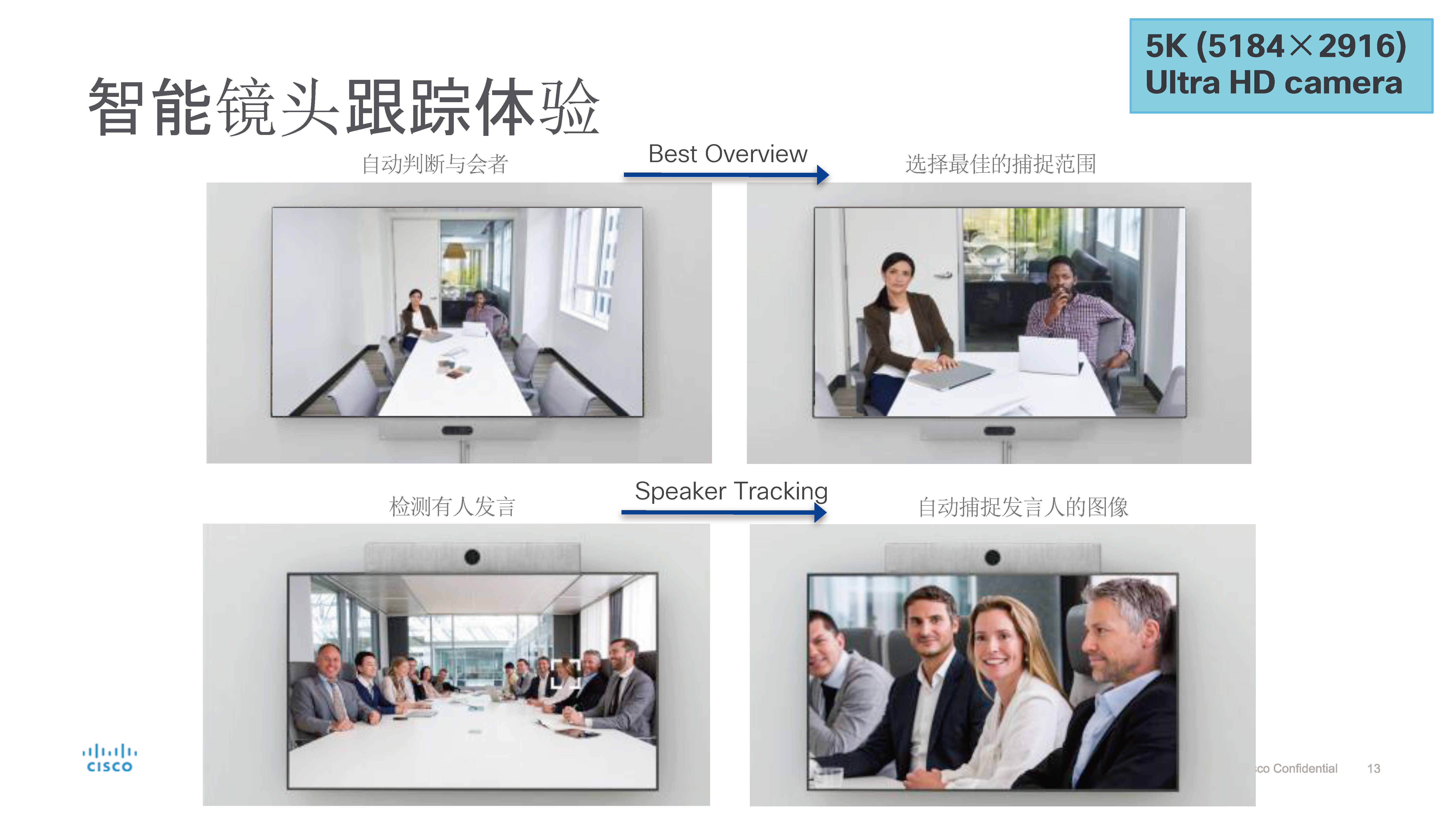 现在用得最多的就是镜头跟踪,这是我们在现有设备中的第一个应用,为什么?会议分为会前、会中、会后,会中经常做的一个操作是什么?是摇镜头。A领导说完话,B领导接着说话,这时候镜头要摇过去,以前这个动作要靠人完成,但现在简化了,自动搞定,谁说话自动给特写。还可以判断房间内坐了多少人。