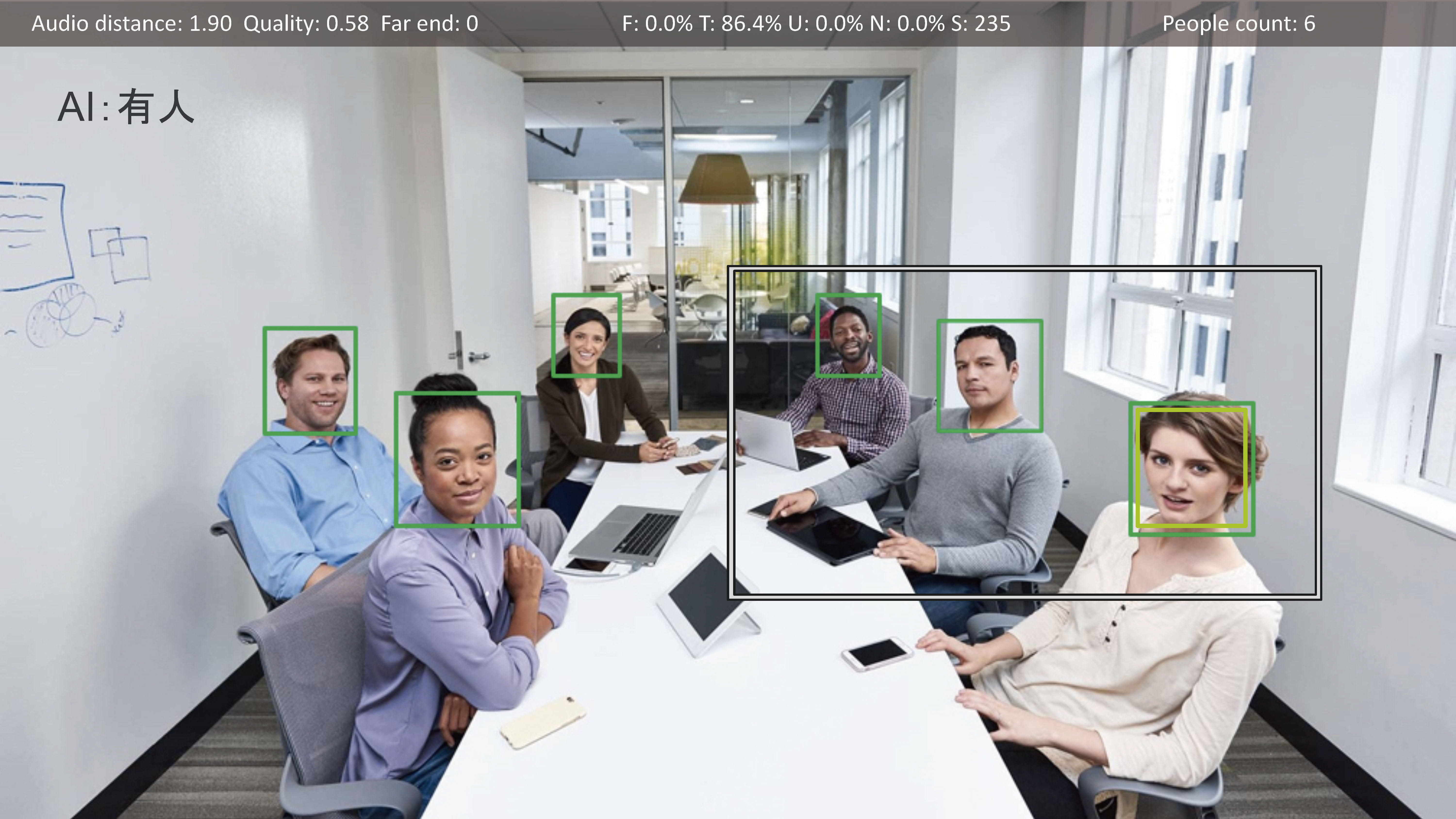 有AI之后,可以做什么事情?第一可以判断画面中有人,还能知道有多少人。比如用到教育行业,就可以判断到底有多少人上课,学生有没有到,等等,都可以检测出。而且谁说话给谁特写,远程教育时,老师说话或者远端一个学生回答问题,直接就能看到学生的表情。