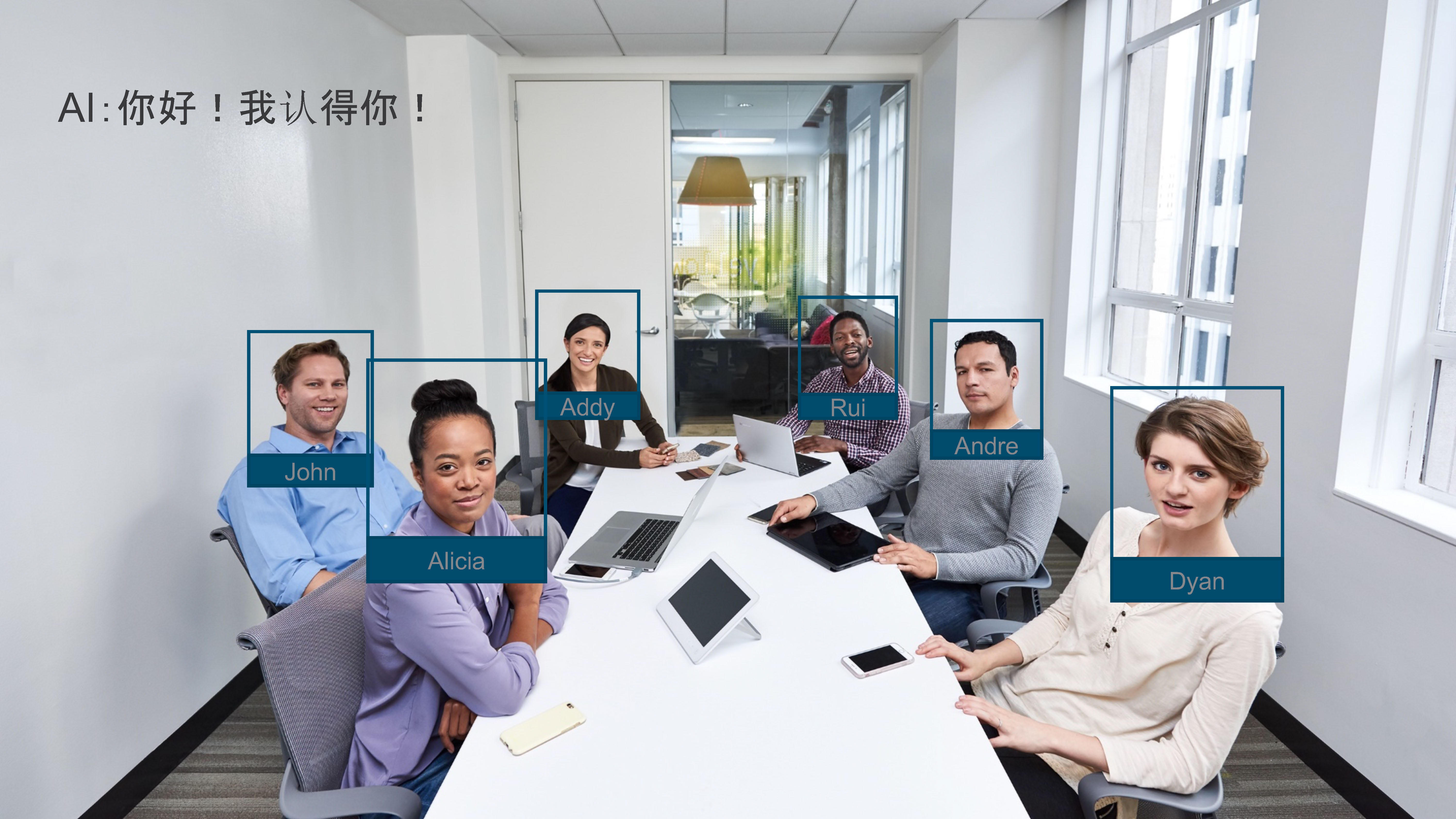 知道有人之后,还能认出这些人——只要有后台数据支持,这样就可以实现人脸签到了,你想代签是没有可能的,坐着有没有认真听、是不是睡着了,AI都能认出来。