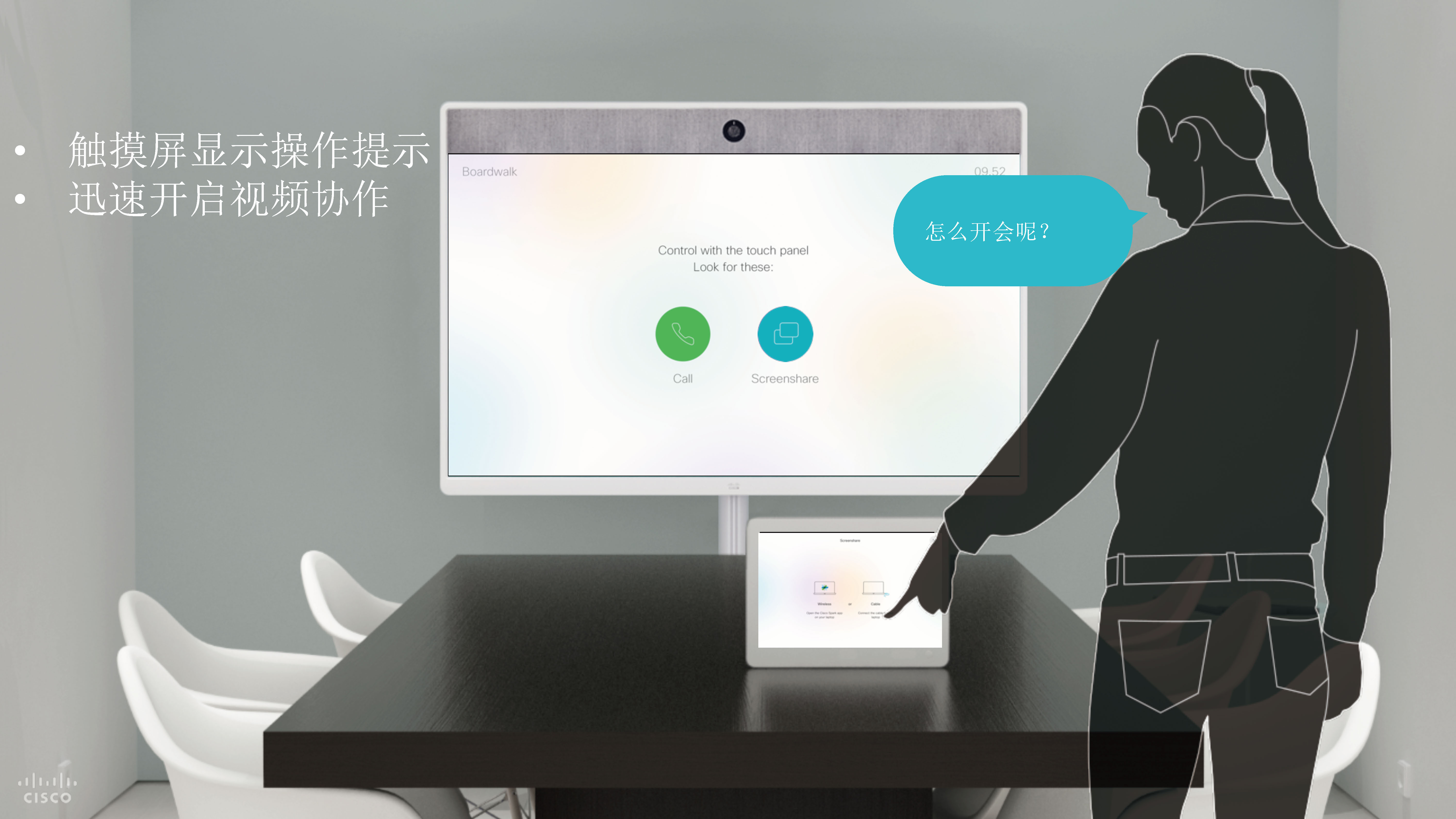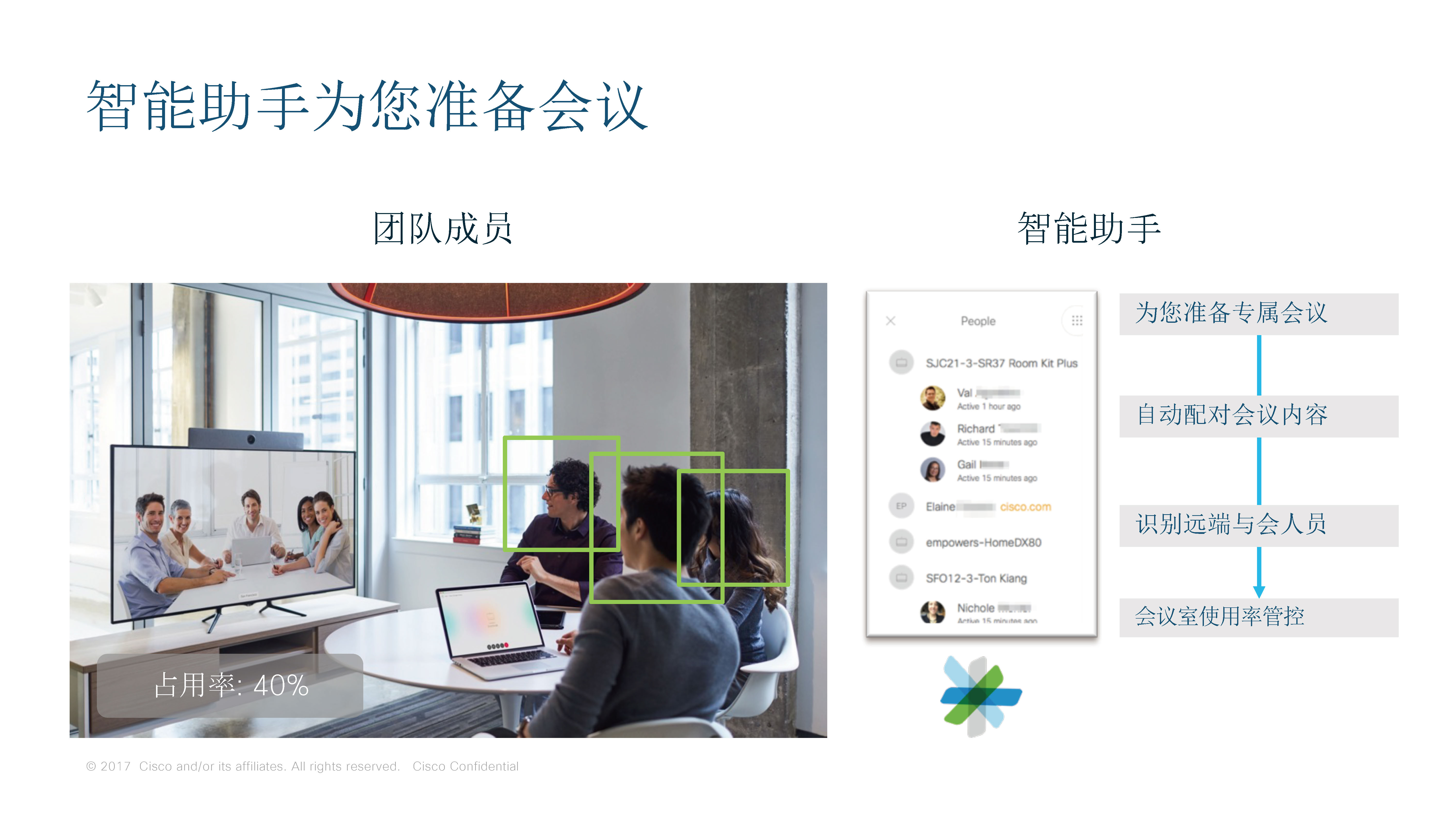 自动配对会议的主要内容,PPT预先准备好。还可以提升会议室的使用效率,比如预定了的会议没人来,可以自动「释放」。可以做的事情非常多,很关键的一点是除了这样的AI芯片,我们还是一个开放的平台,思科的做法是把API开放出来,让大家可以根据API做自己的定制,这样才能融入到企业的文化中,因为每一个企业文化都不太一样。