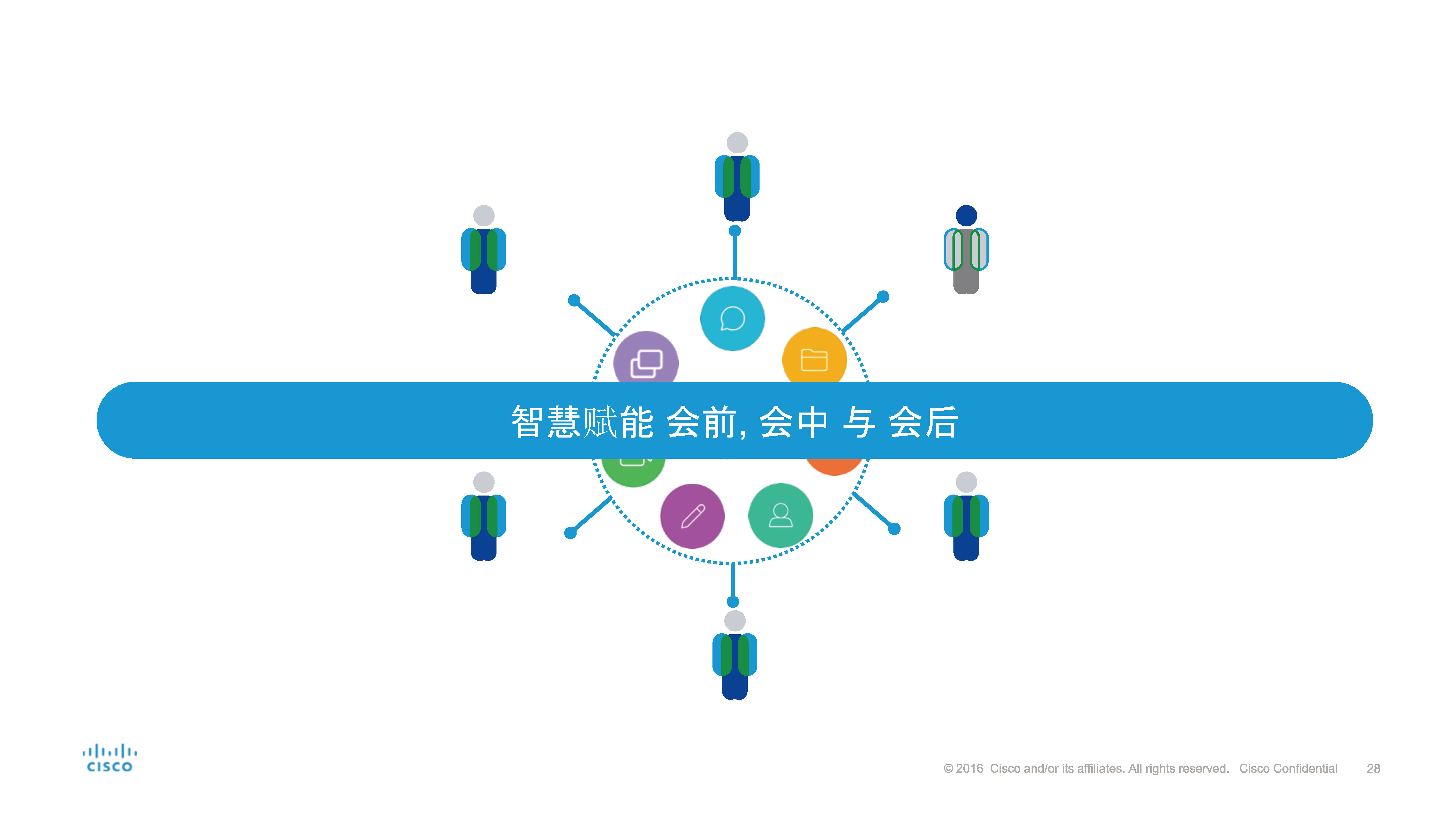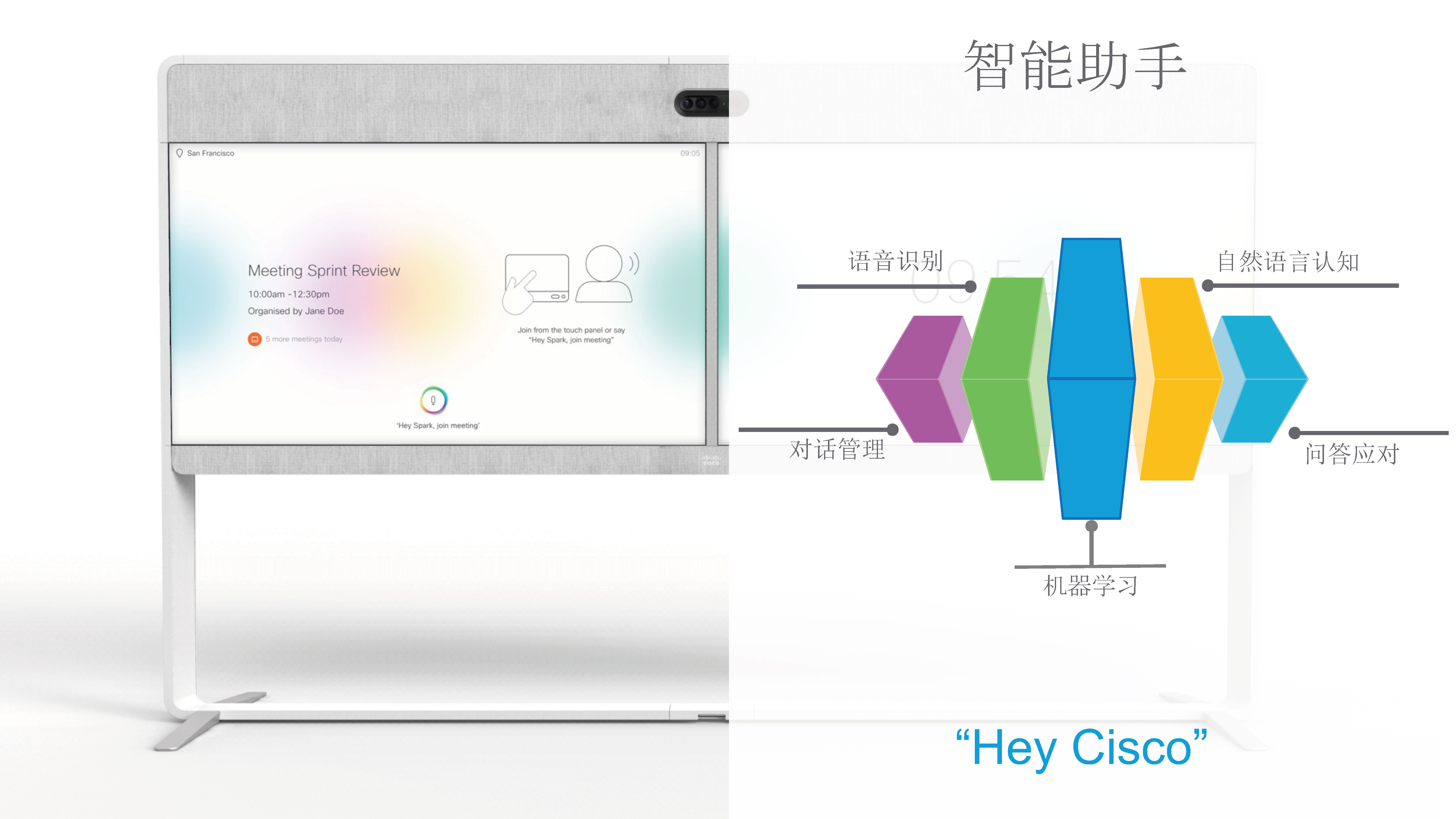 最后总结一下,其实智慧、AI,和会议有非常多的可集成的东西,而思科就是通过这样的智慧前端以及智慧的云平台去实现整个会前、会中与会后的管理,让整个会议充满智慧。最关键的是,思科是一个很开放的平台,不单提供自己的技术,还开放了所有API接口,可以跟很多合作伙伴一起融合在这个平台里面,一起做智慧会议。