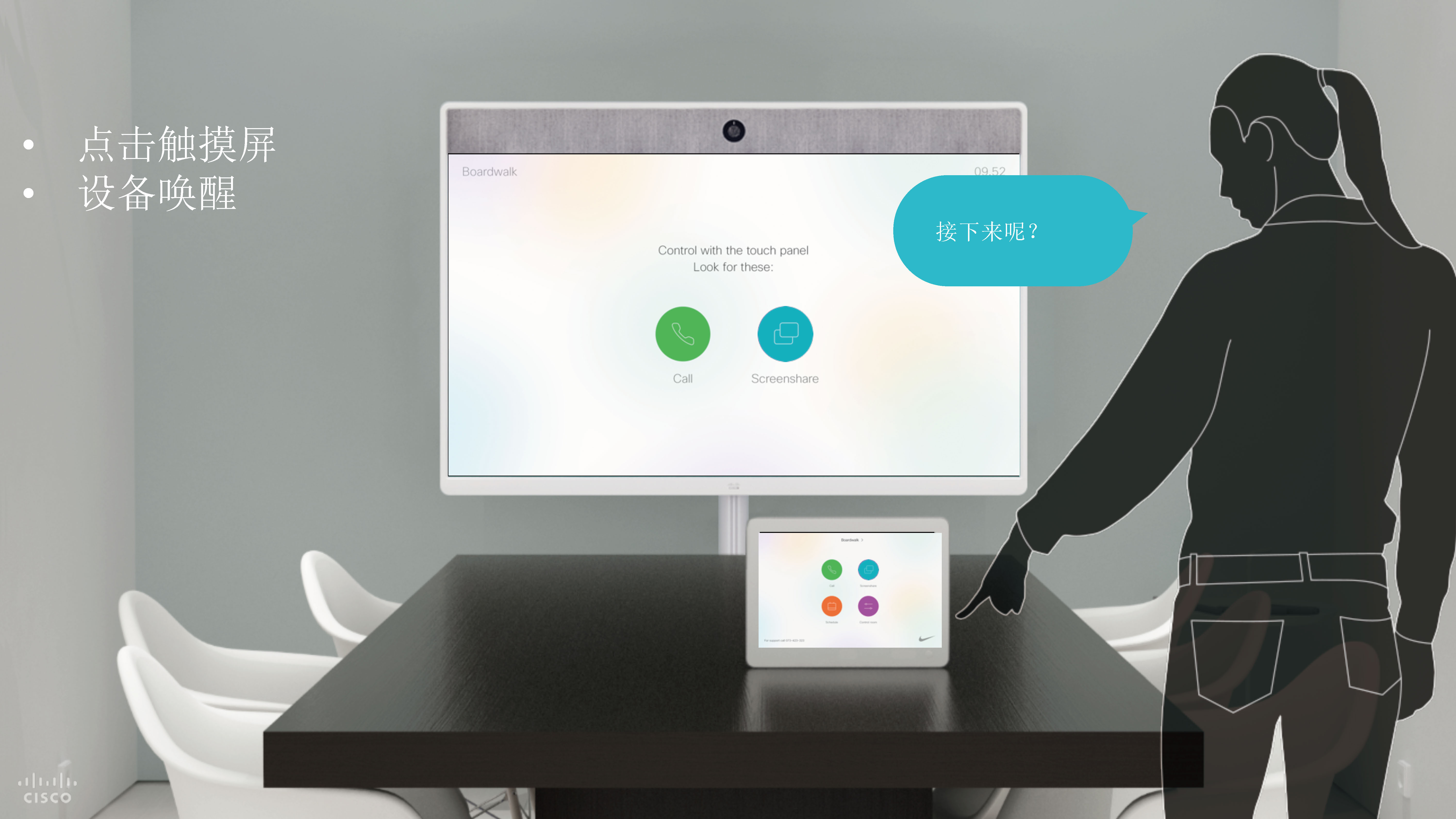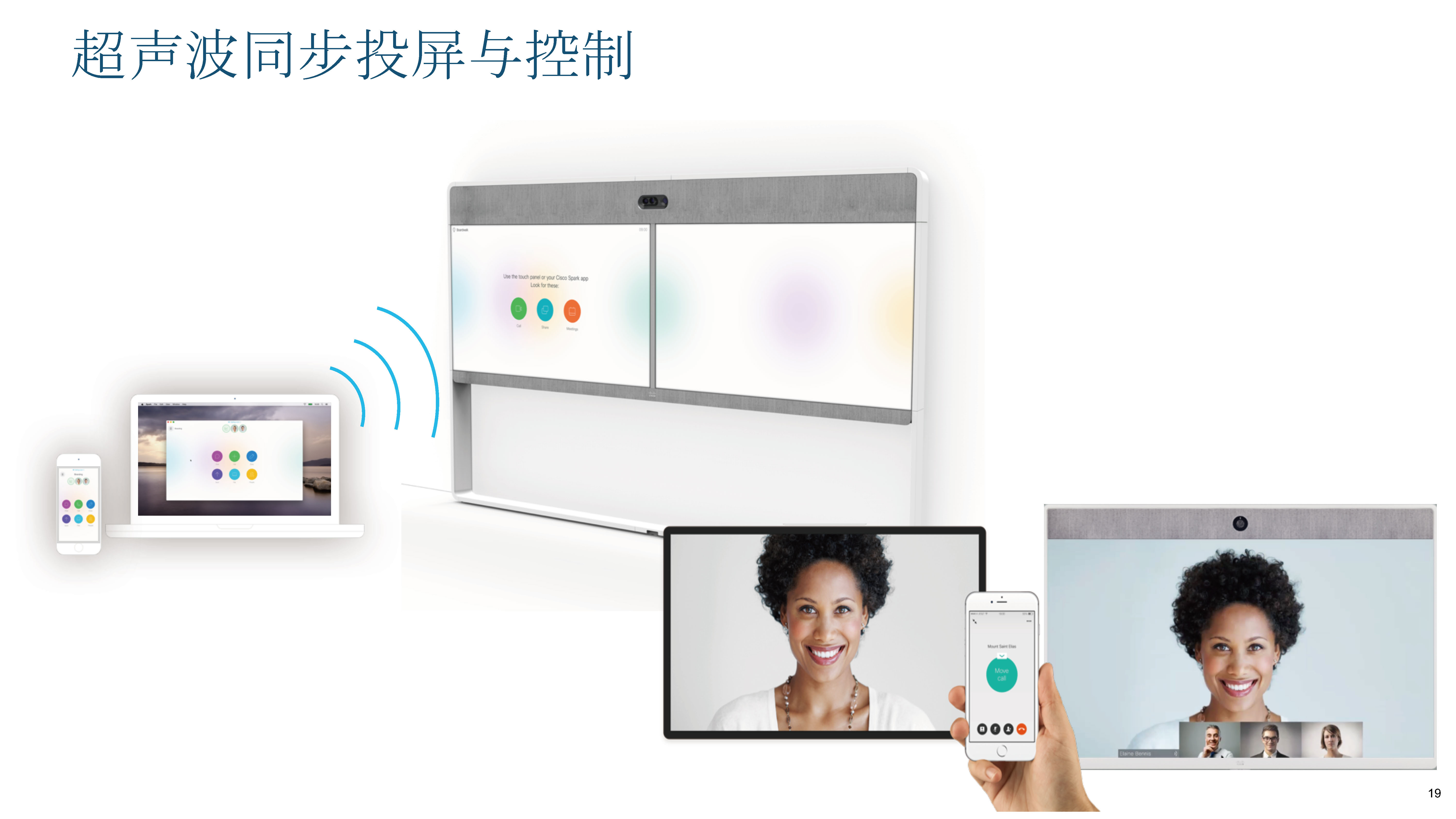 超声波可以用来干什么?思科做了一个超声波同步投屏与控制。拿这个设备来房间里面,根本不用做配对,自动就可以识别设备,可以做一些投屏的动作,甚至可以拿着小平板或者手机直接操控终端。这是超声波同步投屏与控制。