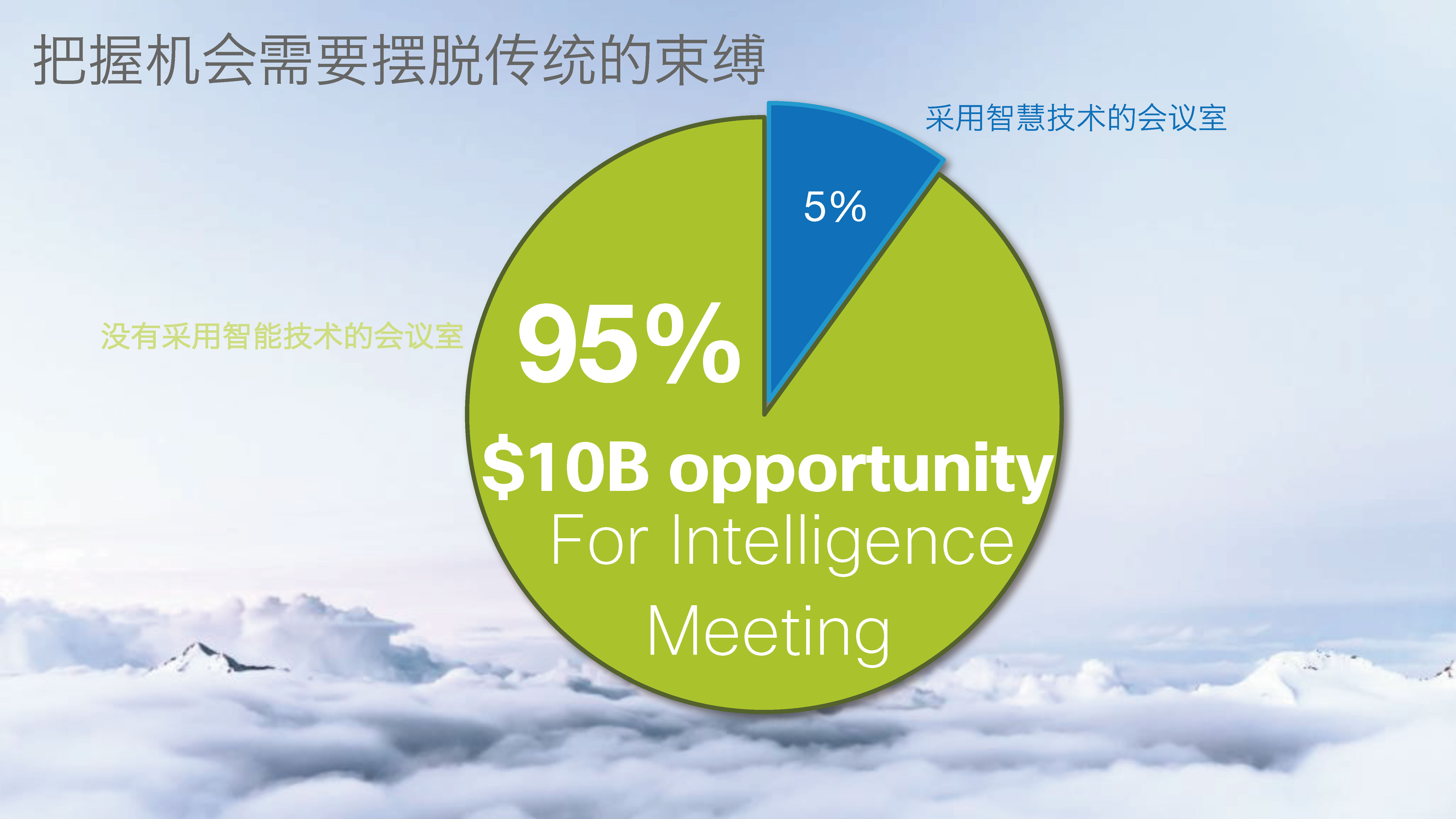 思科有统计,关于智慧会议这个市场究竟能有多大?思科认为有100亿美金这样的庞大市场,而现在已经采用智能技术的会议室,只占5%,还有95%等着我们跟大家一起去开发。