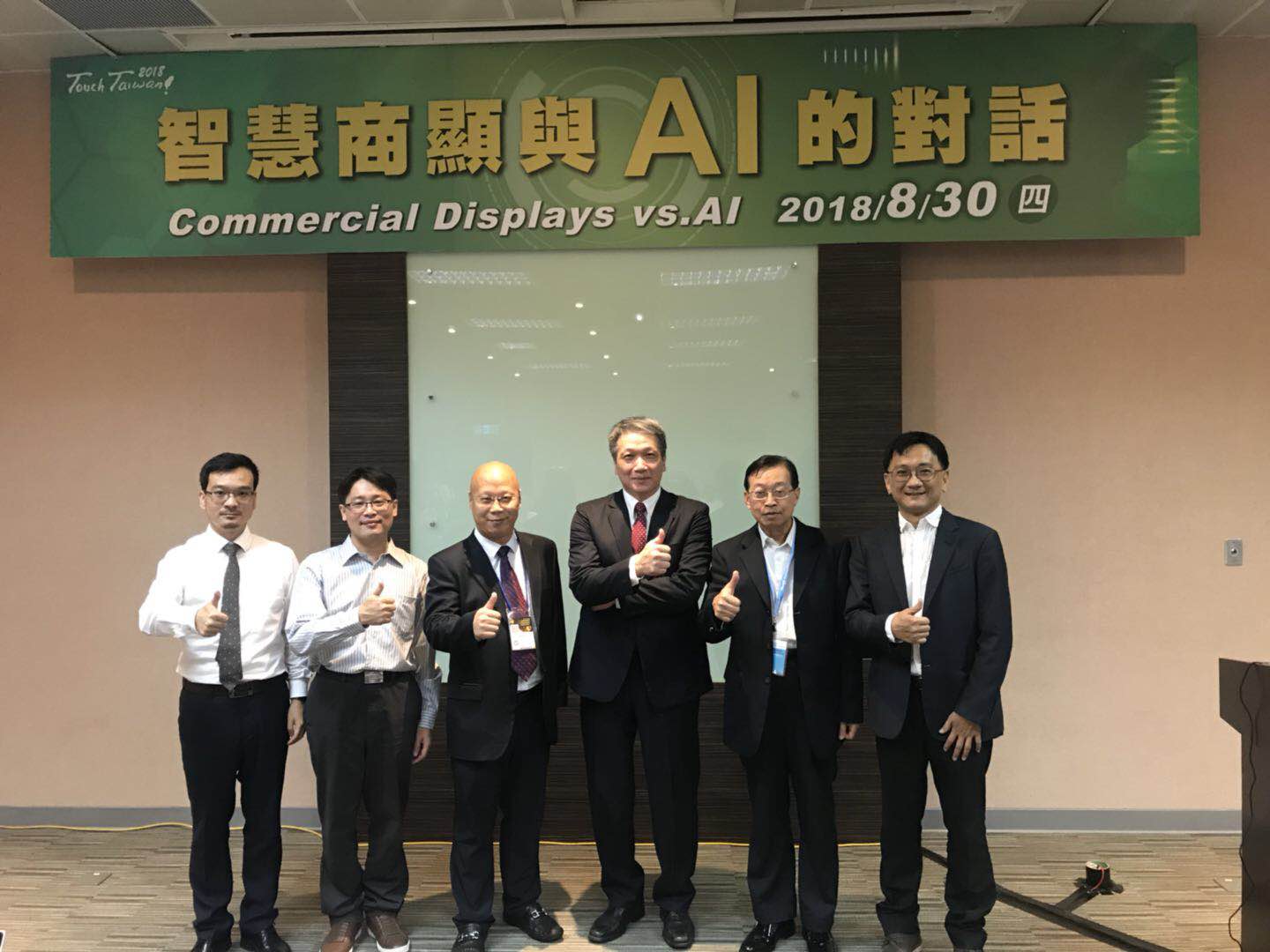 两岸智慧商显与AI的对话:左一为深圳商显产促会副会长单位北京奥维云网大数据科技有限公司高级副总裁董敏、左三为深圳商显产促会秘书长梁毅、右四为台湾数位看板多媒体联盟会长郑乾池