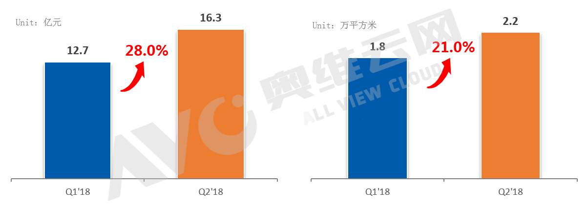 2018年H1中国小间距LED国内市场销售额和销售面积及其环比 ![]()