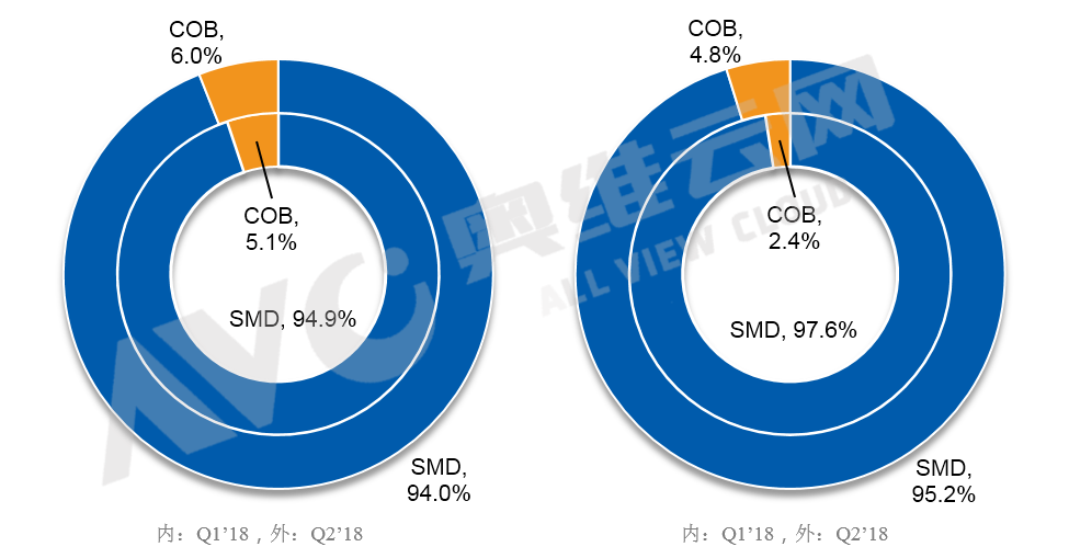 中国小间距LED国内市场两种技术销售额(左)和销售面积(右)分布 ![]() 数据来源:奥维云网(AVC)显示器件与系统大数据