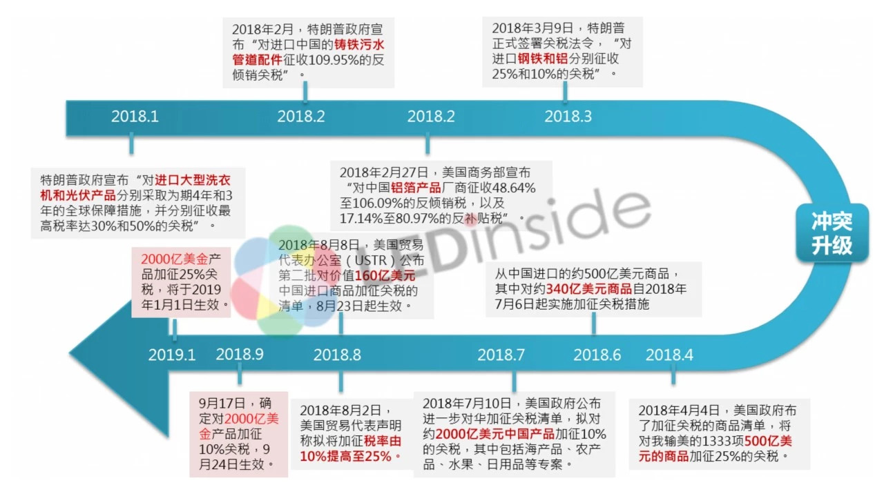 简单回顾中美贸易战的发展过程,一开始针对洗衣机和光伏行业征税的时候,大部分人还对贸易战不以为然。直到4月份500亿关税清单列出。此时,人们开始明白特朗普是玩真的了