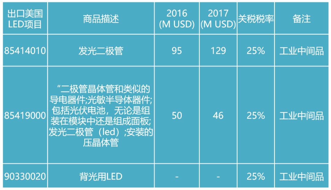 第一轮关税清单出来的时候,主要的跟LED相关的code主要就是3项,而这几项都是LED产业的工业中间品,不是面对消费者的,下游客户主要是照明厂商一类的应用品生产厂商,中国每年对美国出口的规模都不大。