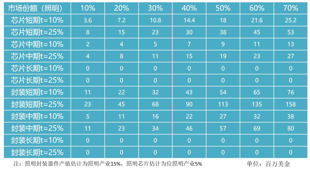 封装环节因为在照明产业链成本结构中占比更高,受到的影响相对更大。但是,封装厂商的市占率普遍不高,即使是市占率达到10%,短期内在10%关税水平下订单的边际下滑仅为1100万美金,在25%的关税水平下,也不过2300万美金。