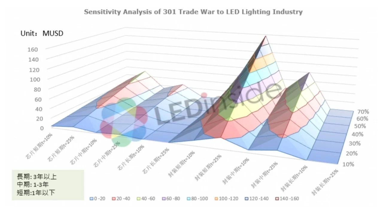 我们以中国出口商承担的损失份额为基础,可以对相关的LED供应商根据不同期限情景做出敏感性分析,量化LED产业链实际可能造成的影响。