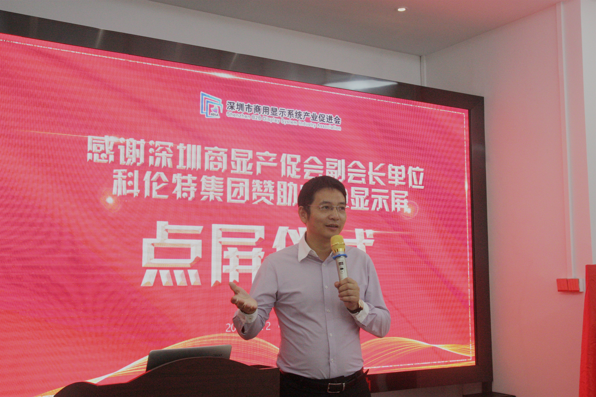 此次揭牌仪式场地的LED大屏由深圳商显产促会副会长单位科伦特提供,现场特意安排了一个「点屏仪式」,由科伦特董事长段四才主持进行。