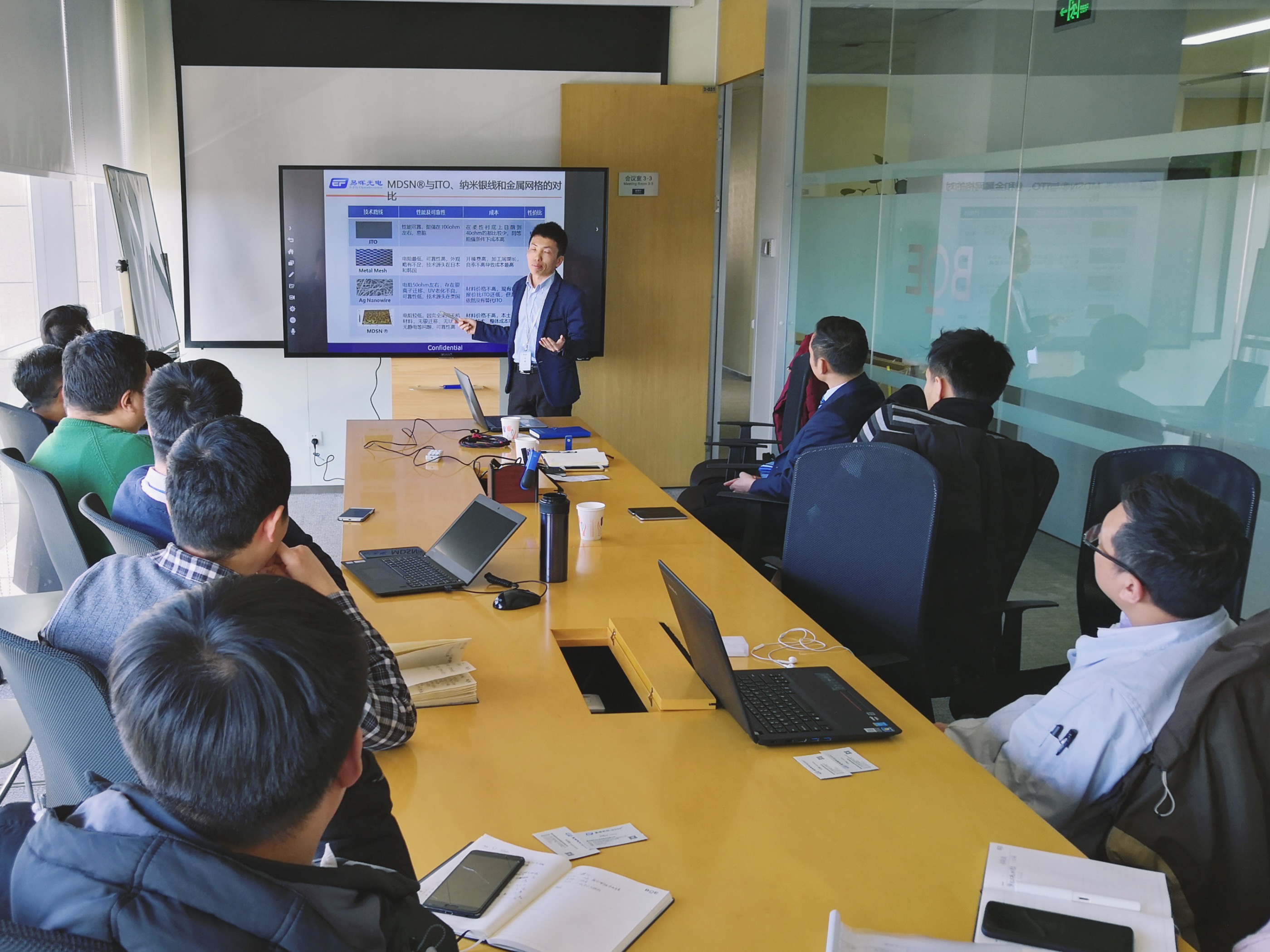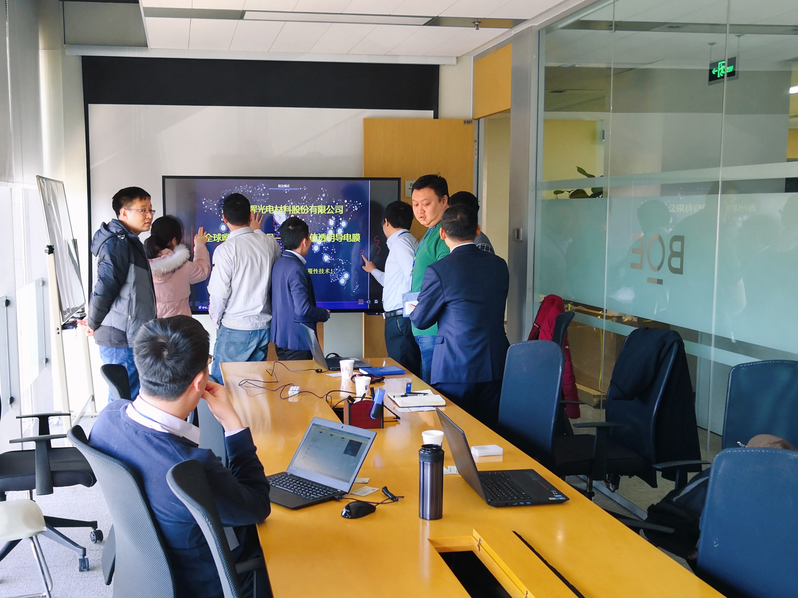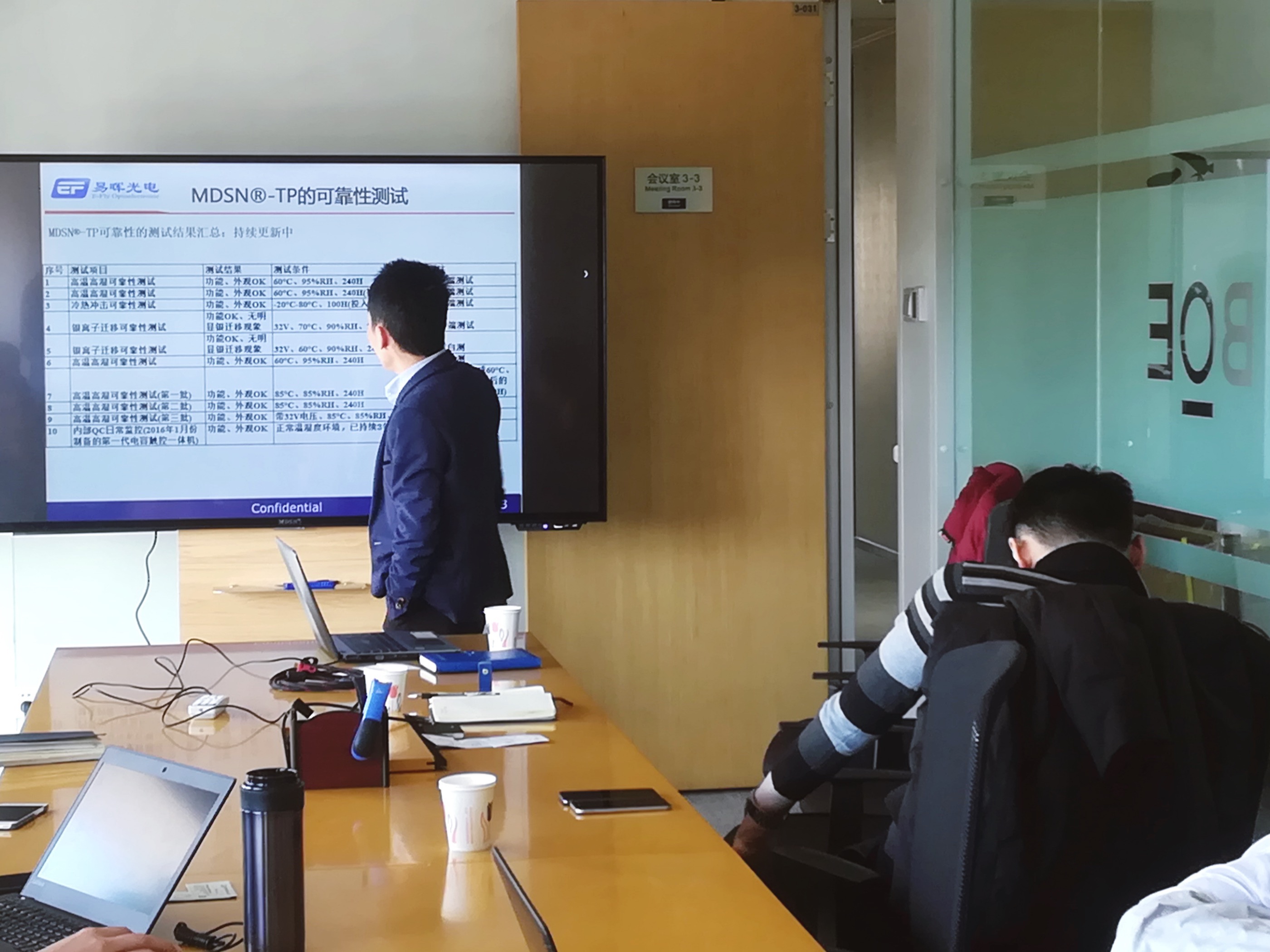 易晖制造中心高级总监林总监用易晖自己的会议机为BOE的技术专家们做了MDSN ®的技术讲解,现场解答了关于MDSN的性能指标、可靠性问题和技术特点等问题。BOE会议室气氛热烈,大家对易晖拥有的这一全球独有技术兴趣浓厚,对其优异的综合性能感到振奋。