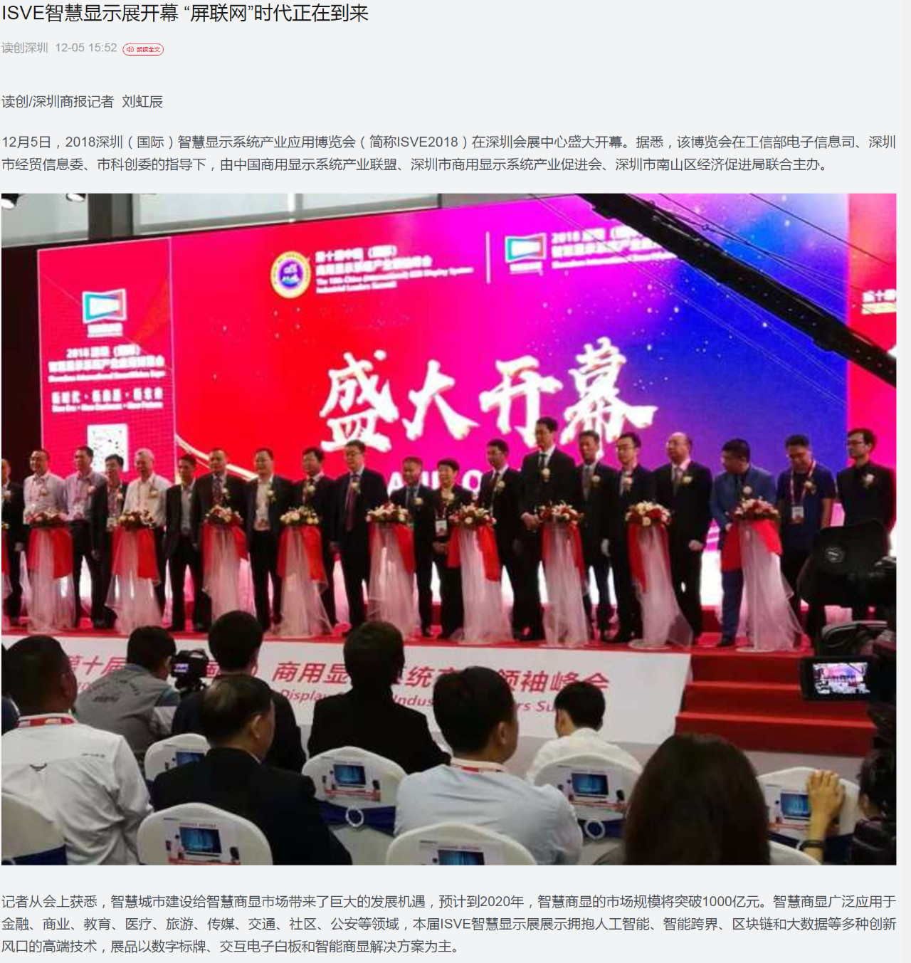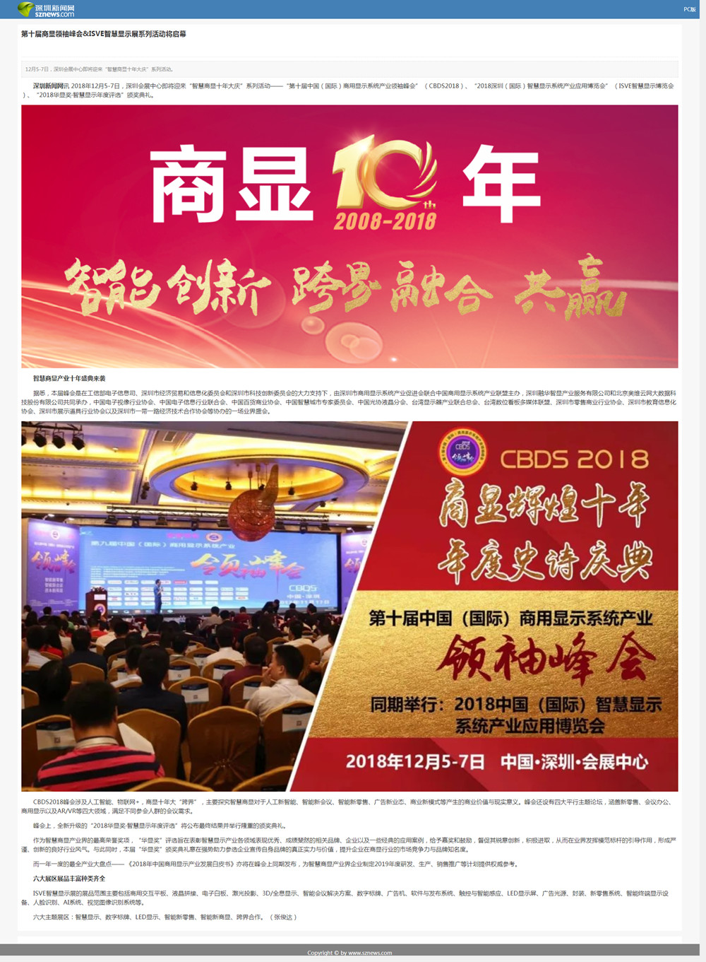 12月7日,历时3天的「商显十年大庆」系列活动,涵盖第十届中国(国际)商用显示系统产业领袖峰会(CBDS 2018)、2018深圳(国际)智慧显示系统产业应用博览会(ISVE 智慧显示展)、「2018华显奖•中国智慧显示年度评选颁奖典礼」、中国智慧商显产业专项基金启动仪式、《2018年中国商用显示产业发展白皮书》发布仪式在深圳会展中心8号馆圆满落幕。