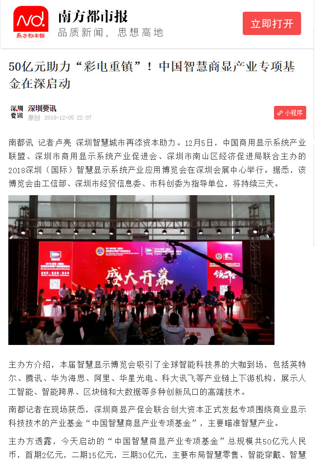 智能显示广泛应用于金融、商业、教育、医疗、旅游、传媒、交通、社区、公安等领域,中国智慧商显产业专项基金的设立将对深圳一大批本土高科技民营企业带来利好。