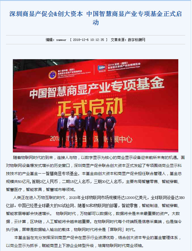 由深圳商显产促会和创大资本设立的中国智慧商显产业专项基金将充分发挥深圳商显产促会在商用显示行业的资源优势,结合创大资本专业的基金管理体系,以商业显示为抓手,赋能商显上下游企业转型升级,培育物联网时代商业领袖。