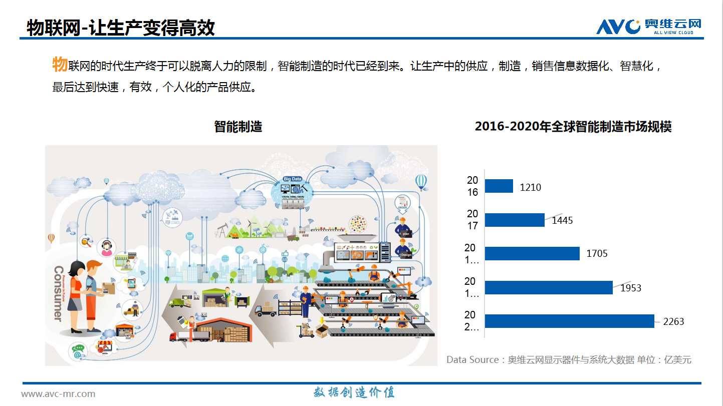 右边是全球的智能制造的市场规模,当下来看,智能制造还是比较初级,如无人关灯工厂或者是智能化改造方面。2018年,智能制造是在1700亿美金左右的水平,到了2020年会达到2263亿美金的水平。